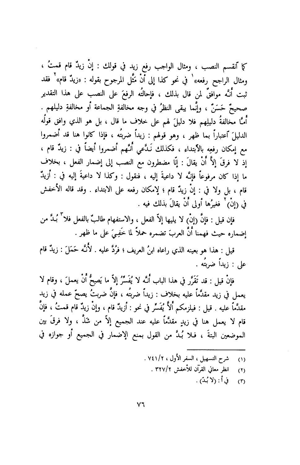 كما انقسم النصب, ومثال الواجب رفع زيد في قولك: إنْ زيدٌ قام قمتُ, ومثال الراجح رفعه)) في نحو كذا إلى أنْ مثّل المرجوح بقوله: ((زيدٌ قام)) فقد ثبت أنّه موافق لمن قال بذلك, فإحالته الرفع على النصب على هذا التقدير صحيحٌ حسنٌ, وإنّما يبقى النظرُ في وجه مخالفة الجماعة أو مخالفة دليلهم. أمّا مخالفة دليلهم فلا دليل لهم على خلاف ماقال, بل هو الذي زافق قولُه الدليل اعتبارًا بما ظهر, وهو قولهم: زيدًا ضربتُه, فإذا كانوا هنا قد أضمروا مع إمكان رفعه بالابتداء, فكذلك ندّعي أنّهم اضمروا أيضًا في: زيدٌ قام, إذ لا فرق إلّا أن يقال: إنّا مضطرون مع النصب على إضمار الفعل, بخلاف ما إذا كان مرفوعًا فإنّه لا داعية إليه, فنقول: وكذا لا داعية إليه في: أزيدٌ قام, بل ولا في: إنْ زيدٌ قام؛ لإمكان رفعه على الابتداء. وقد قاله الأخفش في (إنْ) فغيرُها أولى أنْ يقالَ بذلك فيه.