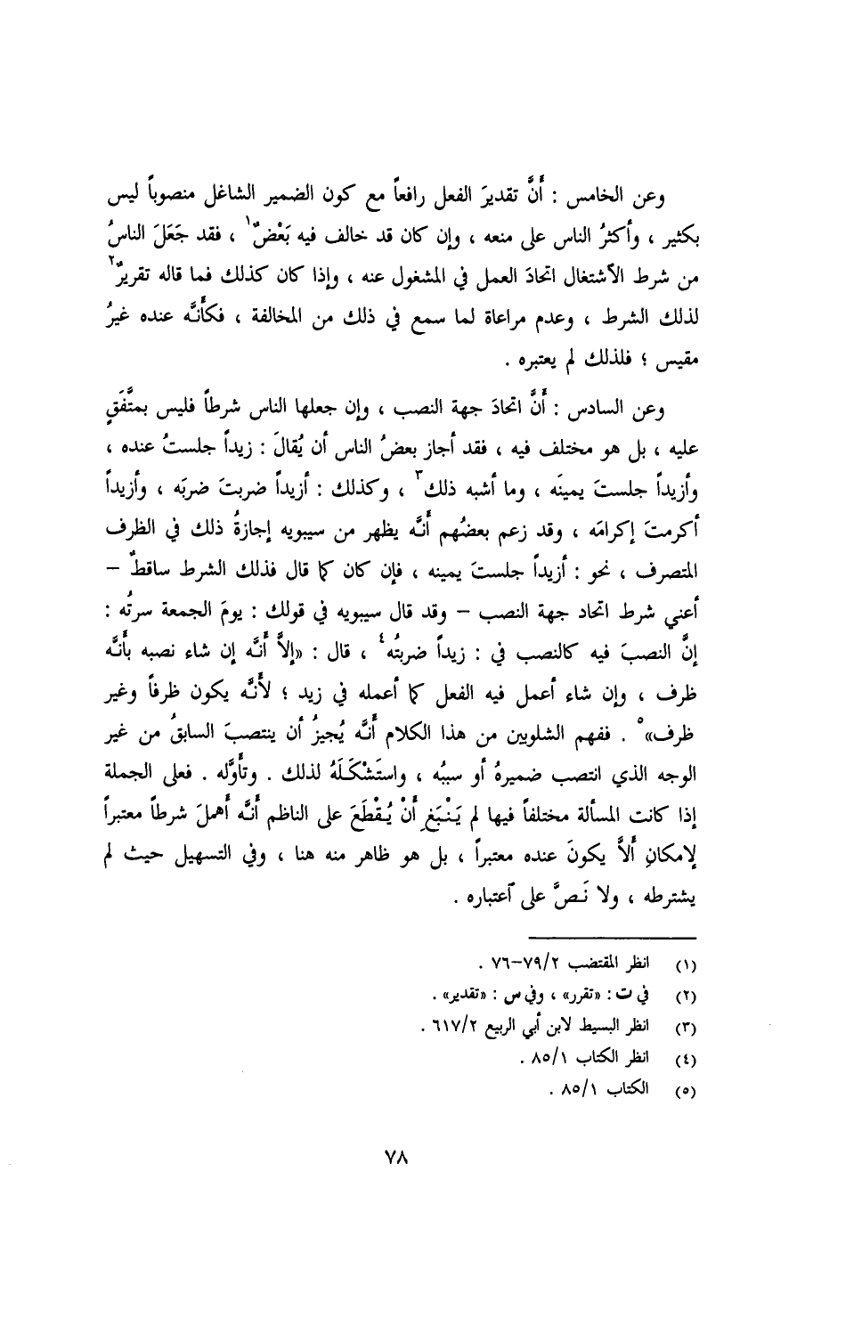 وعن الخامس: أنّ تقديرَ الفعل رافعًا مع كون الضمير الشاغل منصوبًا ليس بكثير, وأكثرُ الناس على منعه, وإن كان قد خالف فيه بعض, فقد جعل الناسُ من شرط الاشتغال اتحاد العمل في المشغول عنه. وإذا كان كذلك فما قاله تقرير لذلك الشرط,, وعدم مراعاة لما سمع في ذلك من المخالفة, فكأنّه عنده غيرُ مقيس؛ فلذلك لم يعتبره.