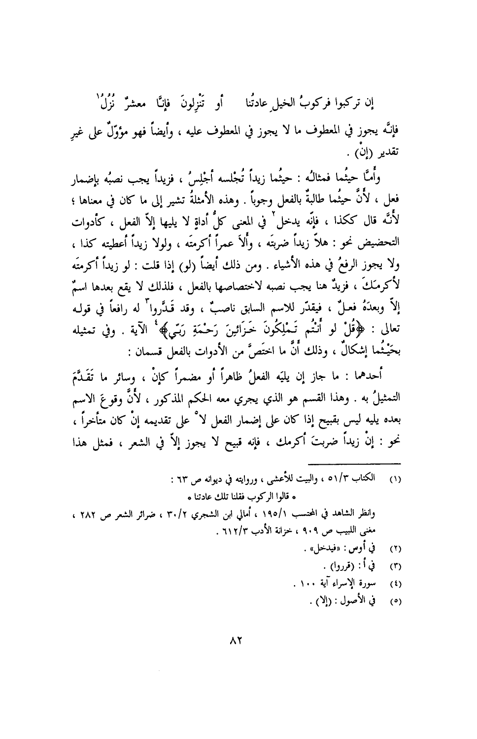 وأمّا حيثُما فمثالُه: حيثما زيدًا تُجلسه أجْلِسُ, فزيدًا يجب نصبُه بإضمار فعل, لأنّ حيثما طالبةٌ بالفعل وجوبًا. وهذه الأمثلة تشير إلى ما كان في معناها؛ لأنّه قال ككذا, فإنّه يدخل في المعنى كلّ اداة لا يليها إلّا الفعل, كأدوات التحضيض نحو: هلّا زيدًا ضربتَه, وألّا عمرًا اكرمتَه, ولولا زيدًا أعطيته كذا, ولا يجوز الرفعُ في هذه الأشياء. ومن ذلك أيضًا (لو) إذا قلت: لو زيدًا أكرمتَه لأكرمك, فزيدٌ هنا يجب نصبه لاختصاصها بالفعل, فلذلك لا يقع بعدها اسمٌ إلّا وبعده فعلٌ, فيقدّر للاسم السابق ناصبٌ, وقد قدّروا له رافعًا في قوله تعالى: {قُلْ لو أنْتُم تَمْلِكونَ خَزائنَ رَحمَةِ رَبّي} الآية. وفي تمثيله بحيثما إشكال, وذلك أنّ ما اختص من الادوات بالفعل قسمان: