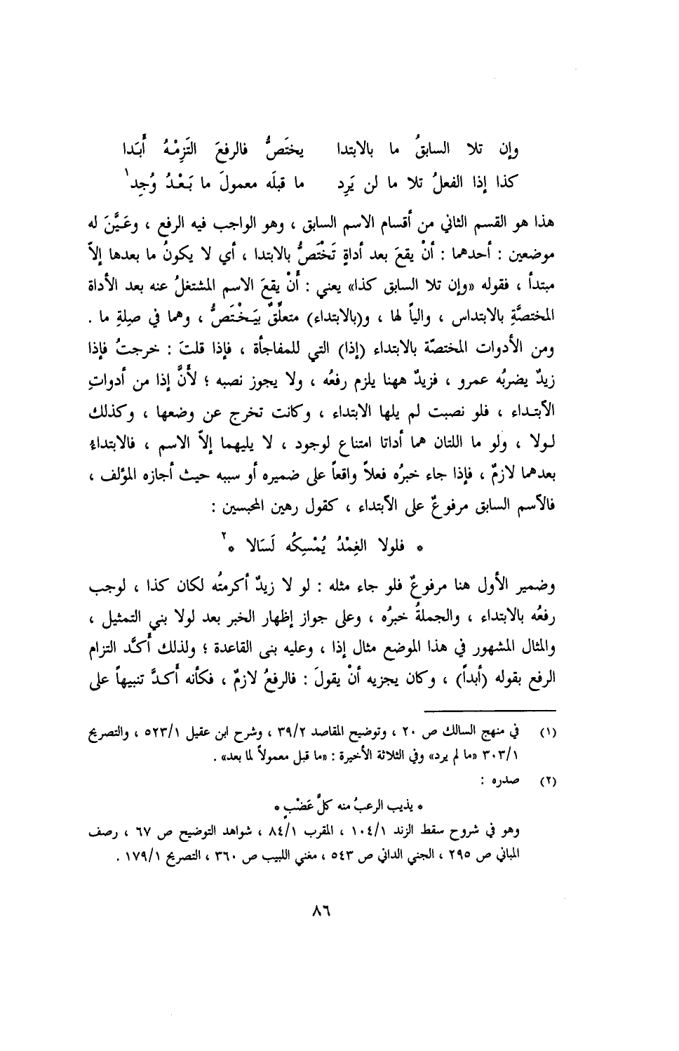 هذا هو القسم الثاني من أقسام الاسم السابق, وهو الواجب فيه الرفع, وعيّنَ له موضعين: أحدهما: أنْ يقعَ بعد أداةٍ تَخْتَصُّ بالابتدا, أي لا يكونُ ما بعدها إلّا مبتدأ, فقوله ((وإن تلا السابق كذا)) يعني: أنْ يقعَ الاسم المشتغلُ عنه بعد الأداة المختصّة بالابتداس$, واليًا لها, و (بالابتداء) متعلّقٌ بيختصّ, وهما في صلة ما. ومن الأدوات المختصّة بالابتداء (إذا) التي للمفاجأة, فإذا قلت: خرجتُ فإذا زيدٌ يضربُه عمرو, فزيدٌ هها يلزم رفعُه, ولا يجوز نصبه؛ لانّ إذا من أدواتِ الابتداء, فلو نصبت لم يلها الابتداء, وكانت تخرج عن وضعها, وكانت تخرج عن وضعها, وكذلك لولا, ولو ما اللتان هما أداتا امتناع لوجود, لا يليها إلّا الاسم, فالابتداءُ بعدهما لازمٌ, فإذا جاء خبرُه فعلًا واقعًا على ضميره أو سببه حيث أجازه المؤلف فالاسم السابق مرفوعٌ على الابتداء, كقول المحبسين:
