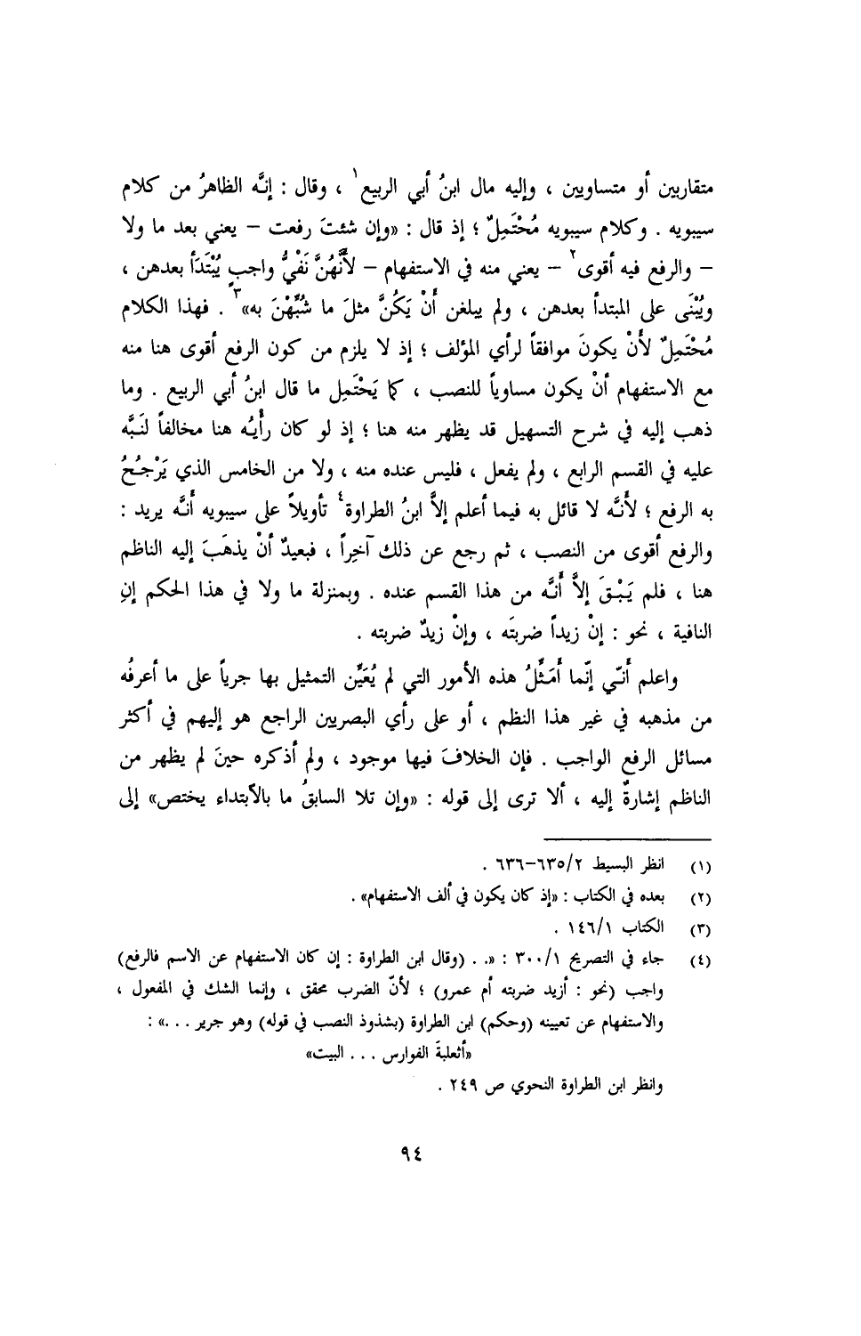 متقاربين أو متساويين, وإليه مال ابنُ أبي الربيع, وقال: إنّه الظاهرُ من كلام سيبويه. وكلام سيبويه مُحتَمِلٌ؛ إذ قال: ((وإن شئت رفعت- يعني بعد ما ولا- والرفع فيه أقوى- يعني منه في الاستفهام- لأنّهن نَفْيّ واجبٍ يثبتدا بعدهن, ويبنى على المبتدأ بعدهن, ولم يبلغن أنْ يَكُنَّ مثلَ ما شُبِّهْنَ به)). فهذا الكلام محتملٌ لأن يكون موافقًا لرأي المؤلف؛ إذ لا يلزم من كون الرفع أقوى هنا منه مع الاستفهام أنْ يكون مساويًا للنصب, كما يَحْتَمِل ما قال ابنُ أبي ربيع. وما ذهب إليه في شرح التسهيل قد يظهر منه هنا؛ إذ لو كان رأيُه هنا مخالفًا لنبّه عليه في القسم الرابع, ولم يفعل, فليس عنده منه, ولا من الخامس الذي يرجح به الرفع؛ لأنّه لا قائل به فما أعلم إلّا ابنُ الطراوة تأويلًا على سيبويه أنّه يريد: والرفع أقوى من النصب, ثم رجع عن ذلك آخرًا, فبعيدٌ أنْ يذهب إليه الناظم هنا, فلم يبقَ إلّا أنّه من هذا القسم عنده. وبمنزلة ما ولا في هذا الحكم إنِ النافية, نحو: إنْ زيدًا ضربتَه, وإنْ زيدٌ ضربته.