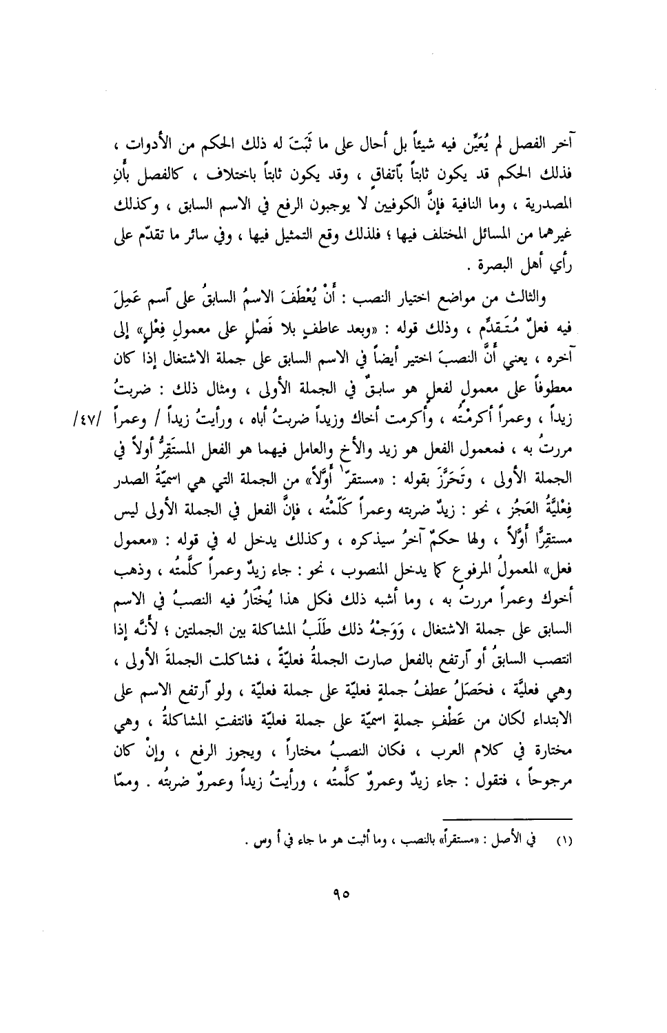 والثالث من مواضع اختيار النصب: أنْ يُعْطَف الاسمُ السابقُ على اسم عَمِلَ فيه فعلٌ متقدّم, وذلك قوله: ((وبعد عاطفٍ بلا فصلٍ على معمولِ فِعْلِ)) إلى آخره, يعني أنّ النصب اختير أيضًا في الاسم السابق على جملة الاشتغال إذا كان معطوفًا على معمول لفعل هو سابقٌ في الجملة الأولى, ومثال ذلك: ضربتُ زيدًا, وعمرًا أكرمتُه, وأكرمت أخاك وزيدًا ضربتُ أباه, ورأيتُ زيدًا/ وعمرًا مررتُ به, فمعمول الفعل هو زيد والأخ والعامل فيهما هو الفعل المستقّر أولًا في الجملة الأولى, وتحرّز بقوله: ((مستقر أوّلا)) من الجملة التي هي اسميةٌ الصدر فعليّة العَجُز, نحو: زيدٌ ضربته وعمرًا كلّمته, فإنّ الفعل في الجملة الأولى ليس مستقرّا أوّلًا, ولها حكمٌ آخرُ سيذكره, وكذلك يدخل له في قوله: ((معمول فعل)) المعمول المرفوع كما يدخل المنصوب, نحو: جاء زيدٌ وعمرًا كلّمته, وذهب أخوك وعمرًا مررتُ به, وما أشبه ذلك فكل هذا يُختارُ في النصبُ في الاسم السابق على جملة الاشتغال, ووجهُ ذلك طَلَبُ المشاكلة بين الجملتين؛ لأنّه إذا انتصب السابقُ أو ارتقع بالفعل صارت الجملةُ فعليّة, فشاكلت الجملة الأولى, وهي فعليّة, فحَصَلُ عطفُ جملةٍ فعليّة على جملة فعليّة, ولو ارتفع الاسم على الابتداء لكان من عَطْفِ جملةٍ اسميّة على جملة فعليّة فانتفت المشاكلة, وهي مختارة في كلام العرب, فكان النصبُ مختارًا, ويجوز الرفع, وإنْ كان مرجوحًا, فتقول: جاء زيدٌ وعمروٌ كلّمتُه, ورأيتُ زيدًا وعمروٌ ضربتُه. وممّا