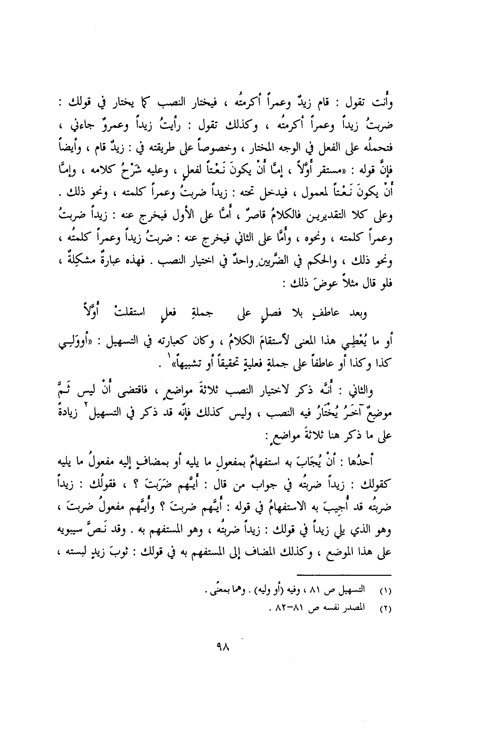 وأنت تقول: قام زيدٌ وعمرًا أكرمتُه, فيختار النصب كما يختار في قولك: ضربتُ زيدًا وعمرًا أكرمتُه, وكذلك تقول: رأبتُ زيدًا وعمروٌ جاءني, قتحملُه على الفعل في الوجه المختار, وخصوصًا على طريقته في: زيدٌ قام, وأيضًا فإنَّ قوله: ((مستقر أوّلًا, إمّا أنْ يكونَ نَعْتًا لفعلٍ, وعليه شرْحُ كلامه, وإمّا أنْ يكون نعتًا لمعمول, فيدخل تحته: زيدًا ضربتُ وعمرًا كلمته, ونحو ذلك. وعلى كلا التقديرين فالكلامُ قاصرٌ, أمّا على الأول فيخرج عنه: زيدًا ضربتُ وعمرًا كلمته, ونحوه, وأمّا على الثاني فيخرج عنه: ضربتُ زيدًا وعمرًا كلمتُه, ونحو ذلك, والحكم في الضّرينِ واحدٌ في اختيار النصب. فهذه عبارةٌ مشكِلةٌ, فلو قال مثلًا عوضَ ذلك:
