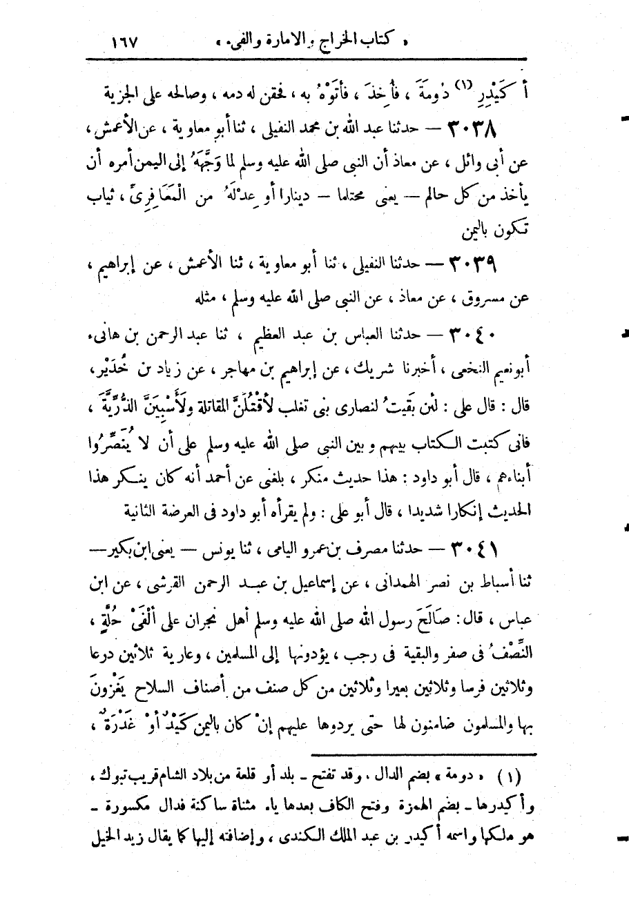 3041 - حَدَّثَنَا مُصَرِّفُ بْنُ عَمْرٍو الْيَامِيُّ، حَدَّثَنَا يُونُسُ يَعْنِي ابْنَ بُكَيْرٍ، حَدَّثَنَا أَسْبَاطُ بْنُ نَصْرٍ الْهَمْدَانِيُّ، عَنْ إِسْمَاعِيلَ بْنِ عَبْدِ الرَّحْمَنِ الْقُرَشِيِّ، عَنِ ابْنِ عَبَّاسٍ، قَالَ: «§صَالَحَ رَسُولُ اللَّهِ صَلَّى اللهُ عَلَيْهِ وَسَلَّمَ أَهْلَ نَجْرَانَ عَلَى أَلْفَيْ حُلَّةٍ، النِّصْفُ فِي صَفَرٍ، وَالْبَقِيَّةُ فِي رَجَبٍ، يُؤَدُّونَهَا إِلَى الْمُسْلِمِينَ، وَعَوَرِ ثَلَاثِينَ دِرْعًا، وَثَلَاثِينَ فَرَسًا، وَثَلَاثِينَ بَعِيرًا، وَثَلَاثِينَ مِنْ كُلِّ صِنْفٍ مِنْ أَصْنَافِ السِّلَاحِ، يَغْزُونَ بِهَا، وَالْمُسْلِمُونَ ضَامِنُونَ لَهَا حَتَّى يَرُدُّوهَا عَلَيْهِمْ، إِنْ كَانَ بِالْيَمَنِ كَيْدٌ أَوْ غَدْرَةٌ -[168]- عَلَى أَنْ لَا تُهْدَمَ لَهُمْ بَيْعَةٌ، وَلَا يُخْرَجَ لَهُمْ قَسٌّ، وَلَا يُفْتَنُوا عَنْ دِينِهِمْ مَا لَمْ يُحْدِثُوا حَدَثًا، أَوْ يَأْكُلُوا الرِّبَا»، قَالَ إِسْمَاعِيلُ: فَقَدْ أَكَلُوا الرِّبَا، قَالَ أَبُو دَاوُدَ: «إِذَا نَقَضُوا بَعْضَ مَا اشْتُرِطَ عَلَيْهِمْ فَقَدْ أَحْدَثُوا»