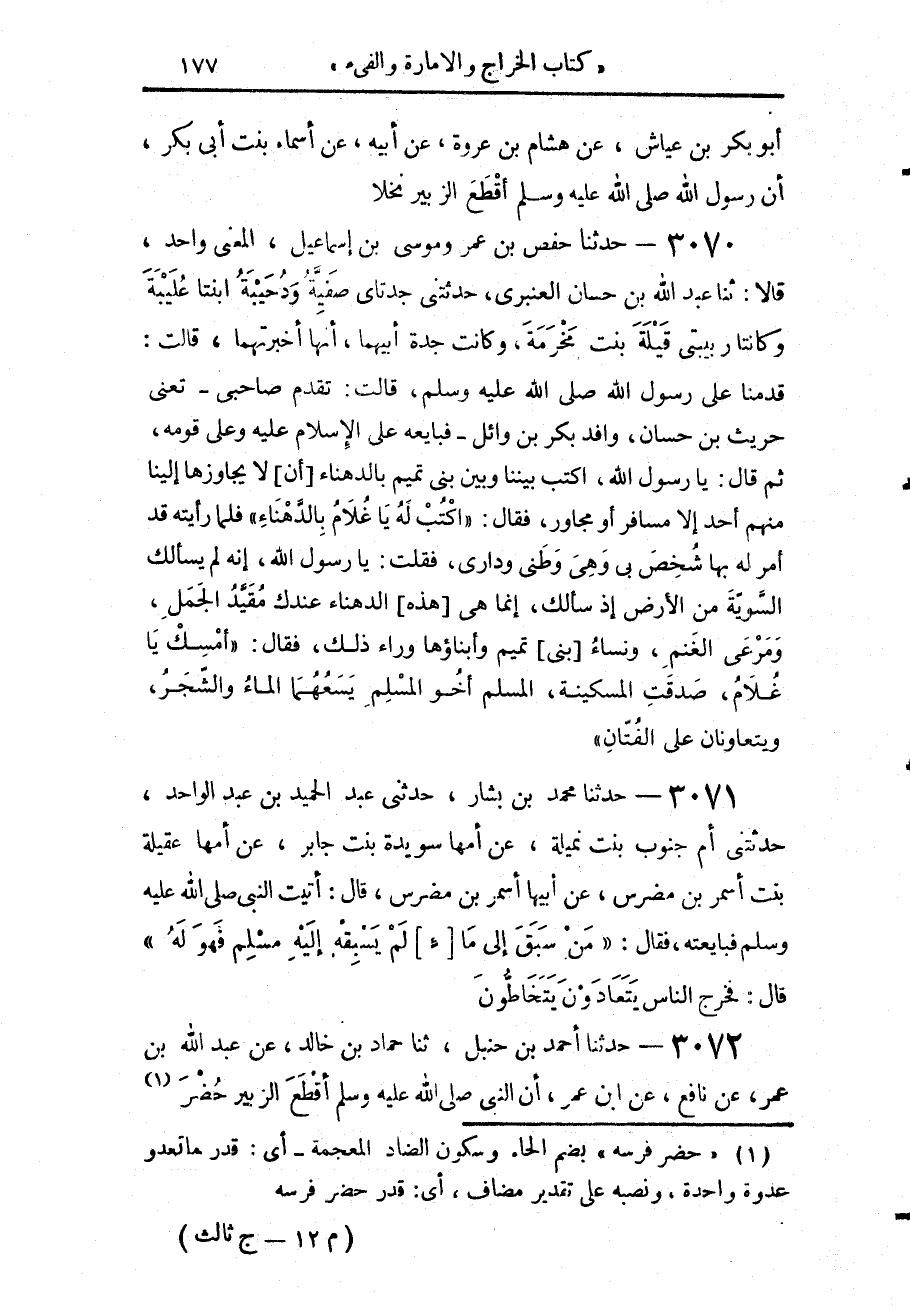 3072 - حَدَّثَنَا أَحْمَدُ بْنُ حَنْبَلٍ، حَدَّثَنَا حَمَّادُ بْنُ خَالِدٍ، عَنْ عَبْدِ اللَّهِ بْنِ عُمَرَ، عَنْ نَافِعٍ، عَنِ ابْنِ عُمَرَ: أَنَّ النَّبِيَّ صَلَّى اللهُ عَلَيْهِ وَسَلَّمَ أَقْطَعَ الزُّبَيْرَ حُضْرَ -[178]- فَرَسِهِ، فَأَجْرَى فَرَسَهُ حَتَّى قَامَ، ثُمَّ رَمَى بِسَوْطِهِ، فَقَالَ: «§أَعْطُوهُ مِنْ حَيْثُ بَلَغَ السَّوْطُ»