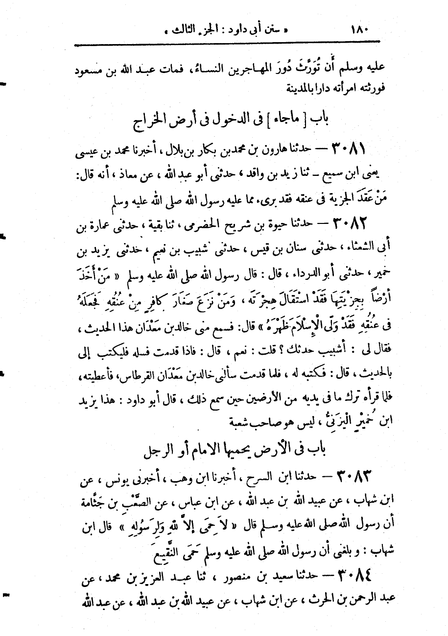 3082 - حَدَّثَنَا حَيْوَةُ بْنُ شُرَيْحٍ الْحَضْرَمِيُّ، حَدَّثَنَا بَقِيَّةُ، حَدَّثَنَا عُمَارَةُ ابْنُ أَبِي الشَّعْثَاءِ، حَدَّثَنِي سِنَانُ بْنُ قَيْسٍ، حَدَّثَنِي شَبِيبُ بْنُ نُعَيْمٍ، حَدَّثَنِي يَزِيدُ بْنُ خُمَيْرٍ، حَدَّثَنِي أَبُو الدَّرْدَاءِ، قَالَ: قَالَ رَسُولُ اللَّهِ صَلَّى اللهُ عَلَيْهِ وَسَلَّمَ: «§مَنْ أَخَذَ أَرْضًا بِجِزْيَتِهَا، فَقَدْ اسْتَقَالَ هِجْرَتَهُ، وَمَنْ نَزَعَ صَغَارَ كَافِرٍ مِنْ عُنُقِهِ فَجَعَلَهُ فِي عُنُقِهِ فَقَدْ وَلَّى الْإِسْلَامَ ظَهْرَهُ» قَالَ: فَسَمِعَ مِنِّي خَالِدُ بْنُ مَعْدَانَ هَذَا الْحَدِيثَ فَقَالَ لِي: أَشُبَيْبٌ حَدَّثَكَ؟ قُلْتُ: نَعَمْ، قَالَ: فَإِذَا قَدِمْتَ فَسَلْهُ فَلْيَكْتُبْ إِلَيَّ بِالْحَدِيثِ، قَالَ: فَكَتَبَهُ لَهُ، فَلَمَّا قَدِمْتُ سَأَلَنِي خَالِدُ بْنُ مَعْدَانَ الْقِرْطَاسَ، فَأَعْطَيْتُهُ، فَلَمَّا قَرَأَهُ تَرَكَ مَا فِي يَدِهِ مِنَ الْأَرْضِينَ حِينَ سَمِعَ ذَلِكَ، قَالَ أَبُو دَاوُدَ: «هَذَا يَزِيدُ بْنُ خُمَيْرٍ الْيَزَنِيُّ، لَيْسَ هُوَ صَاحِبَ شُعْبَةَ»