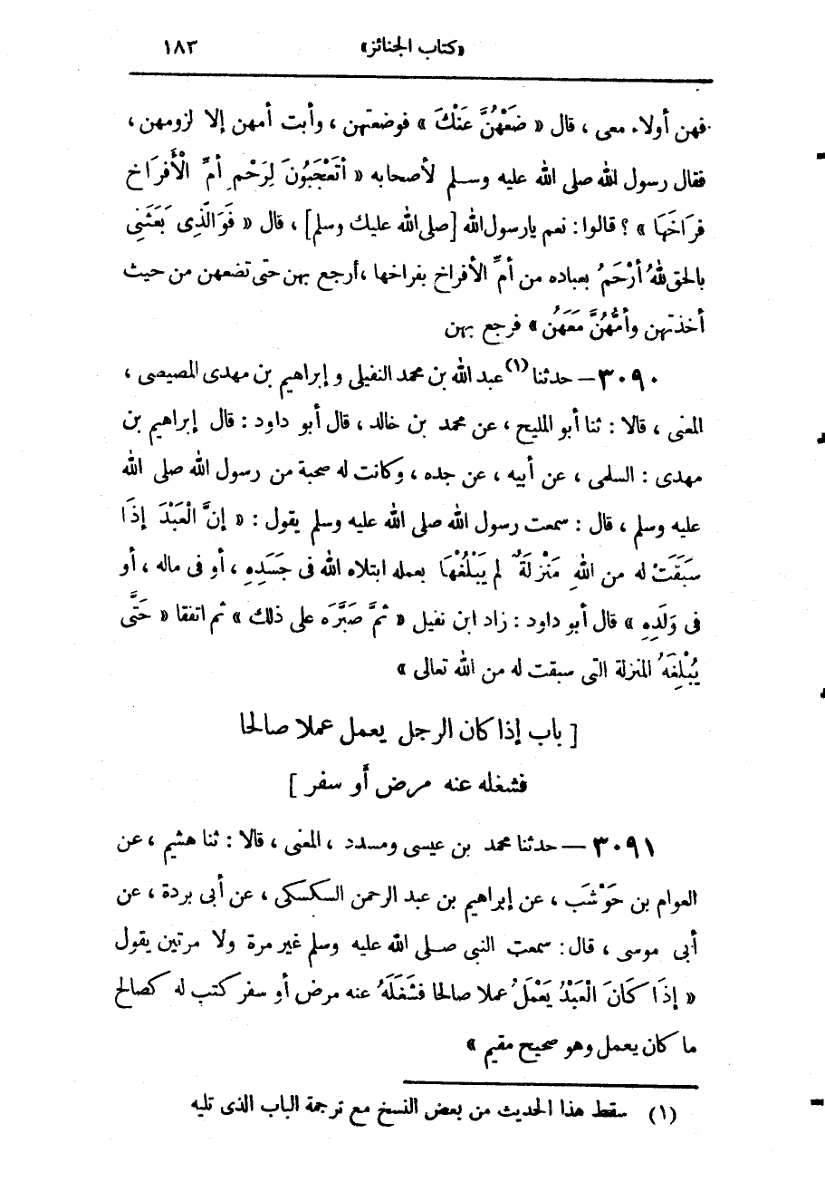 3091 - حَدَّثَنَا مُحَمَّدُ بْنُ عِيسَى، وَمُسَدَّدٌ الْمَعْنَى قَالَا: حَدَّثَنَا هُشَيْمٌ، عَنِ الْعَوَّامِ بْنِ حَوْشَبٍ، عَنْ إِبْرَاهِيمَ بْنِ عَبْدِ الرَّحْمَنِ السَّكْسَكِيِّ، عَنْ أَبِي بُرْدَةَ، عَنْ أَبِي مُوسَى، قَالَ: سَمِعْتُ النَّبِيَّ صَلَّى اللهُ عَلَيْهِ وَسَلَّمَ غَيْرَ مَرَّةٍ، وَلَا مَرَّتَيْنِ يَقُولُ: «§إِذَا كَانَ الْعَبْدُ يَعْمَلُ عَمَلًا صَالِحًا، فَشَغَلَهُ عَنْهُ مَرَضٌ، أَوْ سَفَرٌ، كُتِبَ لَهُ كَصَالِحِ مَا كَانَ يَعْمَلُ، وَهُوَ صَحِيحٌ مُقِيمٌ»