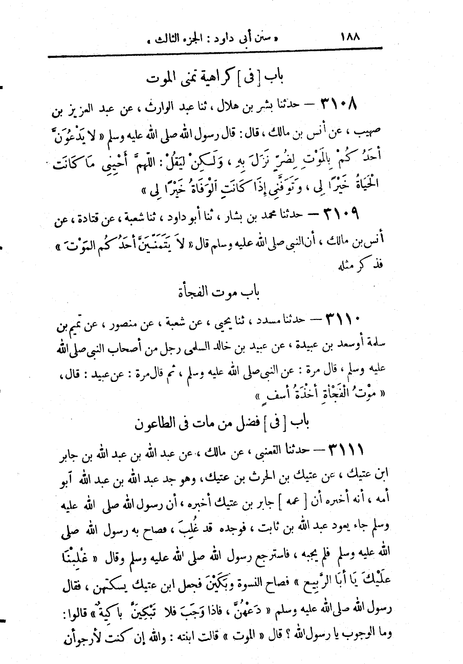 3110 - حَدَّثَنَا مُسَدَّدٌ، حَدَّثَنَا يَحْيَى، عَنْ شُعْبَةَ، عَنْ مَنْصُورٍ، عَنْ تَمِيمِ بْنِ سَلَمَةَ، أَوْ سَعْدِ بْنِ عُبَيْدَةَ، عَنْ عُبَيْدِ بْنِ خَالِدٍ السُّلَمِيِّ، رَجُلٍ مِنْ أَصْحَابِ النَّبِيِّ صَلَّى اللهُ عَلَيْهِ وَسَلَّمَ، قَالَ مَرَّةً: عَنِ النَّبِيِّ صَلَّى اللهُ عَلَيْهِ وَسَلَّمَ، ثُمَّ قَالَ مَرَّةً: عَنْ عُبَيْدٍ، قَالَ: «§مَوْتُ الْفَجْأَةِ أَخْذَةُ أَسَفٍ»