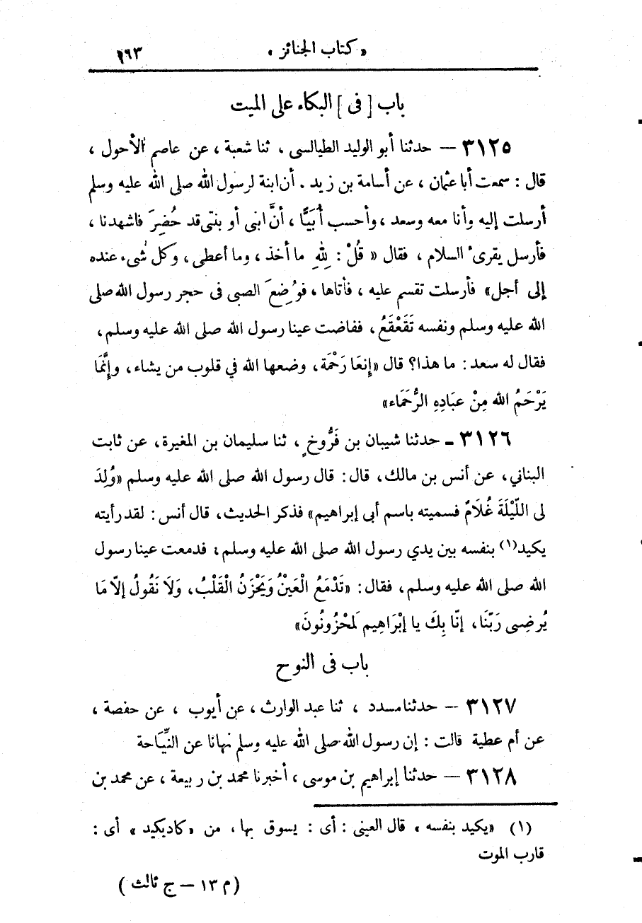 3125 - حَدَّثَنَا أَبُو الْوَلِيدِ الطَّيَالِسِيُّ، حَدَّثَنَا شُعْبَةُ، عَنْ عَاصِمٍ الْأَحْوَلِ، قَالَ: سَمِعْتُ أَبَا عُثْمَانَ، عَنْ أُسَامَةَ بْنِ زَيْدٍ، أَنَّ ابْنَةً لِرَسُولِ اللَّهِ صَلَّى اللهُ عَلَيْهِ وَسَلَّمَ أَرْسَلَتْ إِلَيْهِ وَأَنَا مَعَهُ، وَسَعْدٌ، وَأَحْسَبُ أُبَيًّا: أَنَّ ابْنِي - أَوْ بِنْتِي - قَدْ حُضِرَ فَاشْهَدْنَا، فَأَرْسَلَ يُقْرِئُ السَّلَامَ، فَقَالَ: «قُلْ لِلَّهِ مَا أَخَذَ، وَمَا أَعْطَى وَكُلُّ شَيْءٍ عِنْدَهُ، إِلَى أَجَلٍ» فَأَرْسَلَتْ تُقْسِمُ عَلَيْهِ، فَأَتَاهَا فَوُضِعَ الصَّبِيُّ فِي حِجْرِ رَسُولِ اللَّهِ صَلَّى اللهُ عَلَيْهِ وَسَلَّمَ، وَنَفْسُهُ تَقَعْقَعُ فَفَاضَتْ عَيْنَا رَسُولِ اللَّهِ صَلَّى اللهُ عَلَيْهِ وَسَلَّمَ، فَقَالَ لَهُ سَعْدٌ: مَا هَذَا؟ قَالَ: «§إِنَّهَا رَحْمَةٌ، وَضَعَهَا اللَّهُ فِي قُلُوبِ مَنْ يَشَاءُ، وَإِنَّمَا يَرْحَمُ اللَّهُ مِنْ عِبَادِهِ الرُّحَمَاءَ»