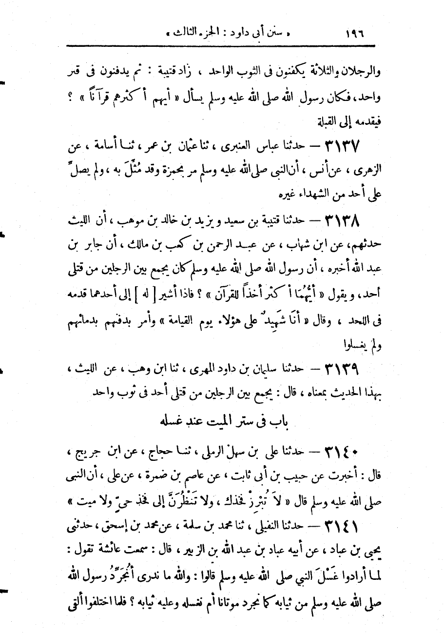 3138 - حَدَّثَنَا قُتَيْبَةُ بْنُ سَعِيدٍ، وَيَزِيدُ بْنُ خَالِدِ بْنِ مَوْهَبٍ، أَنَّ اللَّيْثَ، حَدَّثَهُمْ عَنِ ابْنِ شِهَابٍ، عَنْ عَبْدِ الرَّحْمَنِ بْنِ كَعْبِ بْنِ مَالِكٍ، أَنَّ جَابِرَ بْنَ عَبْدِ اللَّهِ، أَخْبَرَهُ أَنَّ رَسُولَ اللَّهِ صَلَّى اللهُ عَلَيْهِ وَسَلَّمَ كَانَ §يَجْمَعُ بَيْنَ الرَّجُلَيْنِ مِنْ قَتْلَى أُحُدٍ وَيَقُولُ: «أَيُّهُمَا أَكْثَرُ أَخْذًا لِلْقُرْآنِ؟» فَإِذَا أُشِيرَ لَهُ إِلَى أَحَدِهِمَا، قَدَّمَهُ فِي اللَّحْدِ، وَقَالَ: «أَنَا شَهِيدٌ عَلَى هَؤُلَاءِ يَوْمَ الْقِيَامَةِ» وَأَمَرَ بِدَفْنِهِمْ بِدِمَائِهِمْ، وَلَمْ يُغَسَّلُوا،