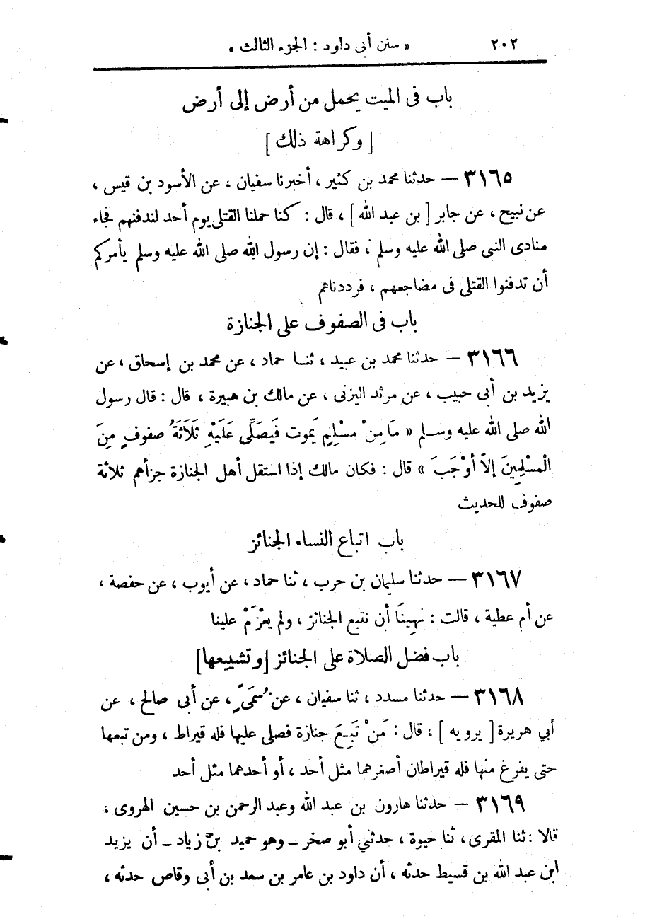 3165 - حَدَّثَنَا مُحَمَّدُ بْنُ كَثِيرٍ، أَخْبَرَنَا سُفْيَانُ، عَنِ الْأَسْوَدِ بْنِ قَيْسٍ، عَنْ نُبَيْحٍ، عَنْ جَابِرِ بْنِ عَبْدِ اللَّهِ، قَالَ: كُنَّا حَمَلْنَا الْقَتْلَى يَوْمَ أُحُدٍ لِنَدْفِنَهُمْ، فَجَاءَ مُنَادِي النَّبِيِّ صَلَّى اللهُ عَلَيْهِ وَسَلَّمَ، فَقَالَ: «إِنَّ رَسُولَ اللَّهِ صَلَّى اللهُ عَلَيْهِ وَسَلَّمَ §يَأْمُرُكُمْ أَنْ تَدْفِنُوا الْقَتْلَى فِي مَضَاجِعِهِمْ» فَرَدَدْنَاهُمْ