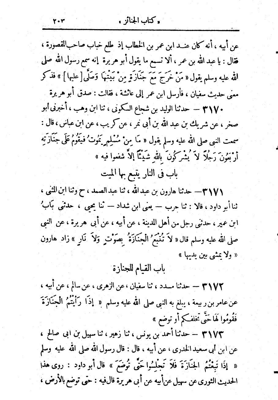 3172 - حَدَّثَنَا مُسَدَّدٌ، حَدَّثَنَا سُفْيَانُ، عَنِ الزُّهْرِيِّ، عَنْ سَالِمٍ، عَنْ أَبِيهِ، عَنْ عَامِرِ بْنِ رَبِيعَةَ، يَبْلُغُ بِهِ النَّبِيَّ صَلَّى اللهُ عَلَيْهِ وَسَلَّمَ: «§إِذَا رَأَيْتُمُ الْجَنَازَةَ فَقُومُوا لَهَا، حَتَّى تُخَلِّفَكُمْ أَوْ تُوضَعَ»