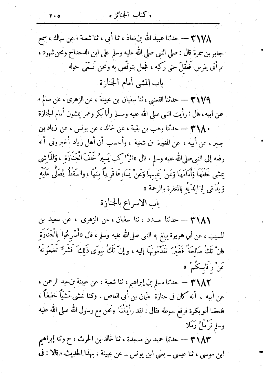 3179 - حَدَّثَنَا الْقَعْنَبِيُّ، حَدَّثَنَا سُفْيَانُ بْنُ عُيَيْنَةَ، عَنِ الزُّهْرِيُّ، عَنْ سَالِمٍ، عَنْ أَبِيهِ، قَالَ: «رَأَيْتُ النَّبِيَّ صَلَّى اللهُ عَلَيْهِ وَسَلَّمَ وَأَبَا بَكْرٍ وَعُمَرَ §يَمْشُونَ أَمَامَ الْجَنَازَةِ»