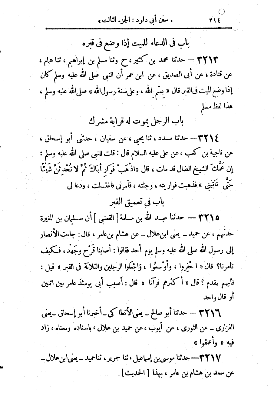 3214 - حَدَّثَنَا مُسَدَّدٌ، حَدَّثَنَا يَحْيَى، عَنْ سُفْيَانَ، حَدَّثَنِي أَبُو إِسْحَاقَ، عَنْ نَاجِيَةَ بْنِ كَعْبٍ، عَنْ عَلِيٍّ عَلَيْهِ السَّلَام، قَالَ: قُلْتُ لِلنَّبِيِّ صَلَّى اللهُ عَلَيْهِ وَسَلَّمَ: إِنَّ عَمَّكَ الشَّيْخَ الضَّالَّ قَدْ مَاتَ، قَالَ: «§اذْهَبْ فَوَارِ أَبَاكَ، ثُمَّ لَا تُحْدِثَنَّ شَيْئًا، حَتَّى تَأْتِيَنِي» فَذَهَبْتُ فَوَارَيْتُهُ وَجِئْتُهُ فَأَمَرَنِي فَاغْتَسَلْتُ وَدَعَا لِي