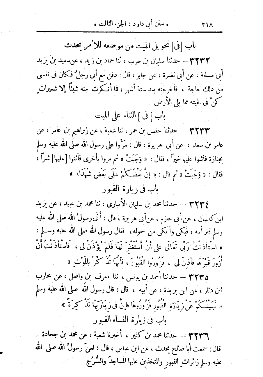 3236 - حَدَّثَنَا مُحَمَّدُ بْنُ كَثِيرٍ، أَخْبَرَنَا شُعْبَةُ، عَنْ مُحَمَّدِ بْنِ جُحَادَةَ، قَالَ: سَمِعْتُ أَبَا صَالِحٍ، يُحَدِّثُ عَنِ ابْنِ عَبَّاسٍ، قَالَ: «§لَعَنَ رَسُولُ اللَّهِ صَلَّى اللهُ عَلَيْهِ وَسَلَّمَ زَائِرَاتِ الْقُبُورِ، وَالْمُتَّخِذِينَ عَلَيْهَا الْمَسَاجِدَ وَالسُّرُجَ»