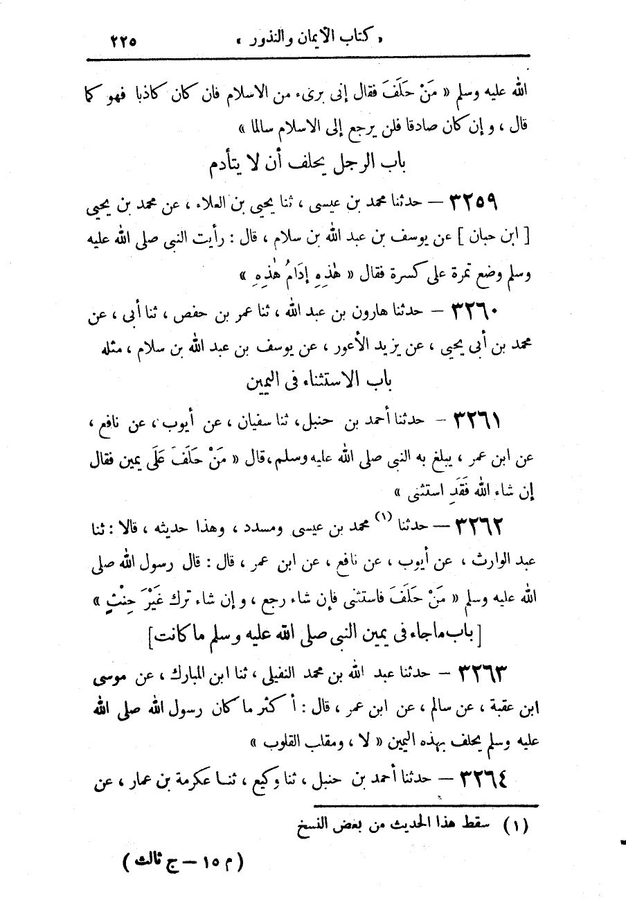 3262 - حَدَّثَنَا مُحَمَّدُ بْنُ عِيسَى، وَمُسَدَّدٌ، وَهَذَا حَدِيثُهُ، قَالَا: حَدَّثَنَا عَبْدُ الْوَارِثِ، عَنْ أَيُّوبَ، عَنْ نَافِعٍ، عَنِ ابْنِ عُمَرَ، قَالَ: قَالَ رَسُولُ اللَّهِ صَلَّى اللهُ عَلَيْهِ وَسَلَّمَ: «§مَنْ حَلَفَ فَاسْتَثْنَى، فَإِنْ شَاءَ رَجَعَ وَإِنْ شَاءَ تَرَكَ غَيْرَ حِنْثٍ»