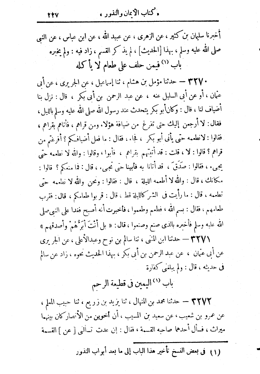 3270 - حَدَّثَنَا مُؤَمَّلُ بْنُ هِشَامٍ، حَدَّثَنَا إِسْمَاعِيلُ، عَنِ الْجُرَيْرِيِّ، عَنْ أَبِي عُثْمَانَ، أَوْ عَنْ أَبِي السَّلِيلِ، عَنْهُ عَنْ عَبْدِ الرَّحْمَنِ بْنِ أَبِي بَكْرٍ، قَالَ: نَزَلَ بِنَا أَضْيَافٌ لَنَا، قَالَ: وَكَانَ أَبُو بَكْرٍ يَتَحَدَّثُ عِنْدَ رَسُولِ اللَّهِ صَلَّى اللهُ عَلَيْهِ وَسَلَّمَ بِاللَّيْلِ، فَقَالَ: لَا أَرْجِعَنَّ إِلَيْكَ حَتَّى تَفْرُغَ مِنْ ضِيَافَةِ هَؤُلَاءِ، وَمِنْ قِرَاهُمْ، فَأَتَاهُمْ بِقِرَاهُمْ، فَقَالُوا: لَا نَطْعَمُهُ حَتَّى يَأْتِيَ أَبُو بَكْرٍ، فَجَاءَ، فَقَالَ: مَا فَعَلَ أَضْيَافُكُمْ؟ أَفَرَغْتُمْ مِنْ قِرَاهُمْ؟ قَالُوا: لَا، قُلْتُ: قَدْ أَتَيْتُهُمْ بِقِرَاهُمْ فَأَبَوْا، وَقَالُوا: وَاللَّهِ لَا نَطْعَمُهُ حَتَّى يَجِيءَ، فَقَالُوا: صَدَقَ، قَدْ أَتَانَا بِهِ فَأَبَيْنَا، حَتَّى تَجِيءَ، قَالَ: فَمَا مَنَعَكُمْ؟ قَالُوا: مَكَانَكَ، قَالَ: وَاللَّهِ لَا أَطْعَمُهُ اللَّيْلَةَ، قَالَ: فَقَالُوا: وَنَحْنُ وَاللَّهِ لَا نَطْعَمُهُ حَتَّى تَطْعَمَهُ، قَالَ: مَا رَأَيْتُ فِي الشَّرِّ كَاللَّيْلَةِ قَطُّ، قَالَ: قَرِّبُوا طَعَامَكُمْ، قَالَ: فَقَرَّبَ طَعَامَهُمْ، فَقَالَ: بِسْمِ اللَّهِ، فَطَعِمَ وَطَعِمُوا، فَأُخْبِرْتُ أَنَّهُ أَصْبَحَ فَغَدَا عَلَى النَّبِيِّ صَلَّى اللهُ عَلَيْهِ وَسَلَّمَ فَأَخْبَرَهُ بِالَّذِي صَنَعَ وَصَنَعُوا، قَالَ: «§بَلْ أَنْتَ أَبَرُّهُمْ وَأَصْدَقُهُمْ»،