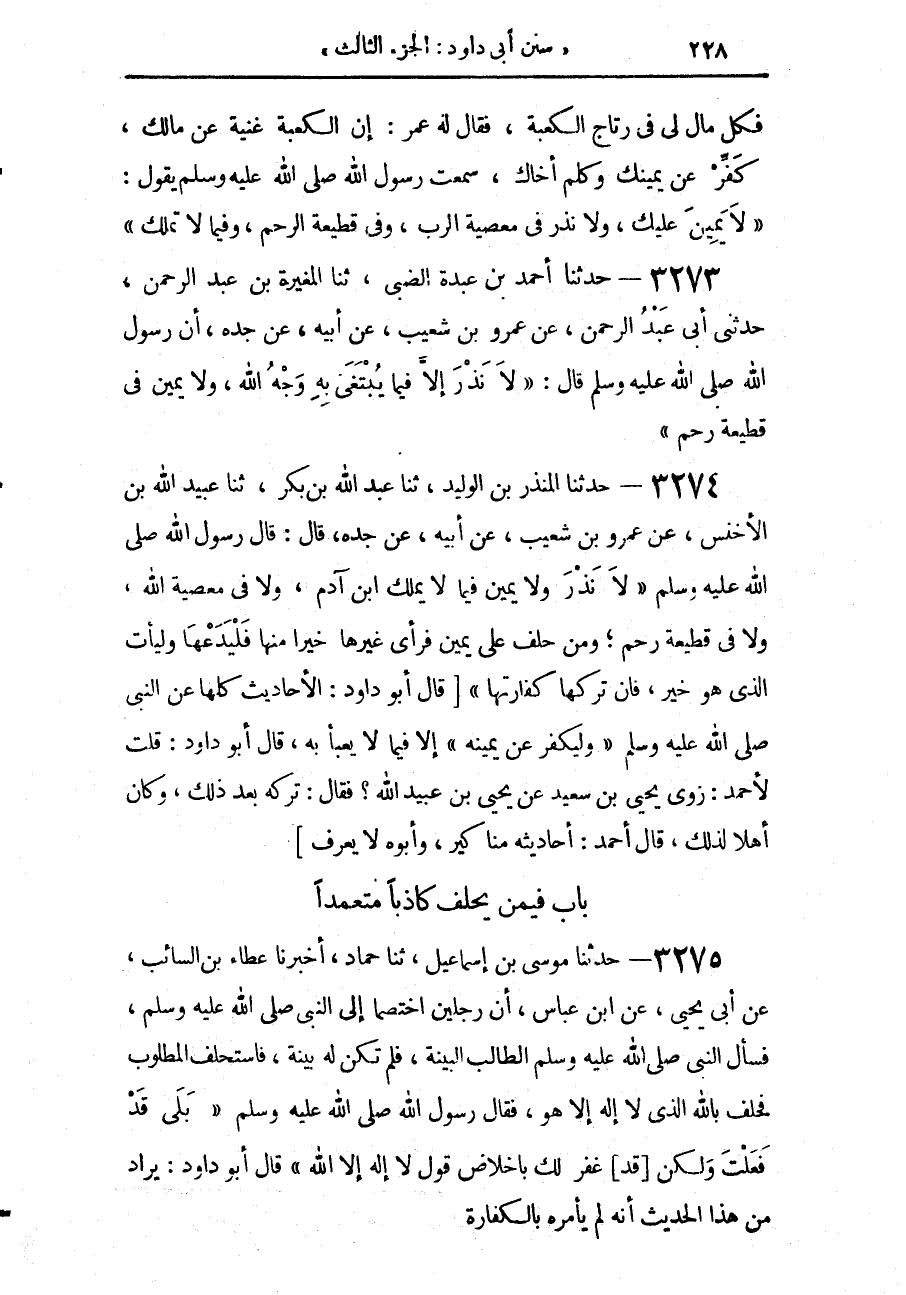 3274 - حَدَّثَنَا الْمُنْذِرُ بْنُ الْوَلِيدِ، حَدَّثَنَا عَبْدُ اللَّهِ بْنُ بَكْرٍ، حَدَّثَنَا عُبَيْدُ اللَّهِ بْنُ الْأَخْنَسِ، عَنْ عَمْرِو بْنِ شُعَيْبٍ، عَنْ أَبِيهِ، عَنْ جَدِّهِ، قَالَ: قَالَ رَسُولُ اللَّهِ صَلَّى اللهُ عَلَيْهِ وَسَلَّمَ: «§لَا نَذْرَ وَلَا يَمِينَ فِيمَا لَا يَمْلِكُ ابْنُ آدَمَ، وَلَا فِي مَعْصِيَةِ اللَّهِ وَلَا فِي قَطِيعَةِ رَحِمٍ وَمَنْ حَلَفَ عَلَى يَمِينٍ فَرَأَى غَيْرَهَا خَيْرًا مِنْهَا فَلْيَدَعْهَا وَلْيَأْتِ الَّذِي هُوَ خَيْرٌ فَإِنَّ تَرْكَهَا كَفَّارَتُهَا»، قَالَ أَبُو دَاوُدَ: الْأَحَادِيثُ كُلُّهَا عَنِ النَّبِيِّ صَلَّى اللهُ عَلَيْهِ وَسَلَّمَ وَلْيُكَفِّرْ عَنْ يَمِينِهِ إِلَّا فِيمَا لَا يَعْبَأُ بِهِ قَالَ أَبُو دَاوُدَ: قُلْتُ لِأَحْمَدَ، رَوَى يَحْيَى بْنُ سَعِيدٍ، عَنْ يَحْيَى بْنِ عُبَيْدِ اللَّهِ، فَقَالَ: تَرَكَهُ بَعْدَ ذَلِكَ، وَكَانَ أَهْلًا لِذَلِكَ قَالَ أَحْمَدُ: أَحَادِيثُهُ مَنَاكِيرُ، وَأَبُوهُ لَا يُعْرَفُ