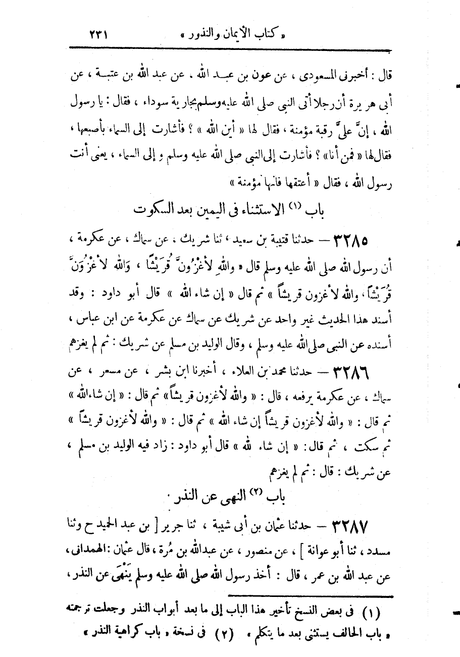 3286 - حَدَّثَنَا مُحَمَّدُ بْنُ الْعَلَاءِ، أَخْبَرَنَا ابْنُ بِشْرٍ، عَنْ مِسْعَرٍ، عَنْ سِمَاكٍ، عَنْ عِكْرِمَةَ، يَرْفَعُهُ، قَالَ: «§وَاللَّهِ لَأَغْزُوَنَّ قُرَيْشًا»، ثُمَّ قَالَ: «إِنْ شَاءَ اللَّهُ» ثُمَّ قَالَ: «وَاللَّهِ لَأَغْزُوَنَّ قُرَيْشًا إِنْ شَاءَ اللَّهُ»، ثُمَّ قَالَ: «وَاللَّهِ لَأَغْزُوَنَّ قُرَيْشًا» ثُمَّ سَكَتَ، ثُمَّ قَالَ: «إِنْ شَاءَ اللَّهُ»، قَالَ أَبُو دَاوُدَ: زَادَ فِيهِ الْوَلِيدُ بْنُ مُسْلِمٍ، عَنْ شَرِيكٍ قَالَ: «ثُمَّ لَمْ يَغْزُهُمْ»