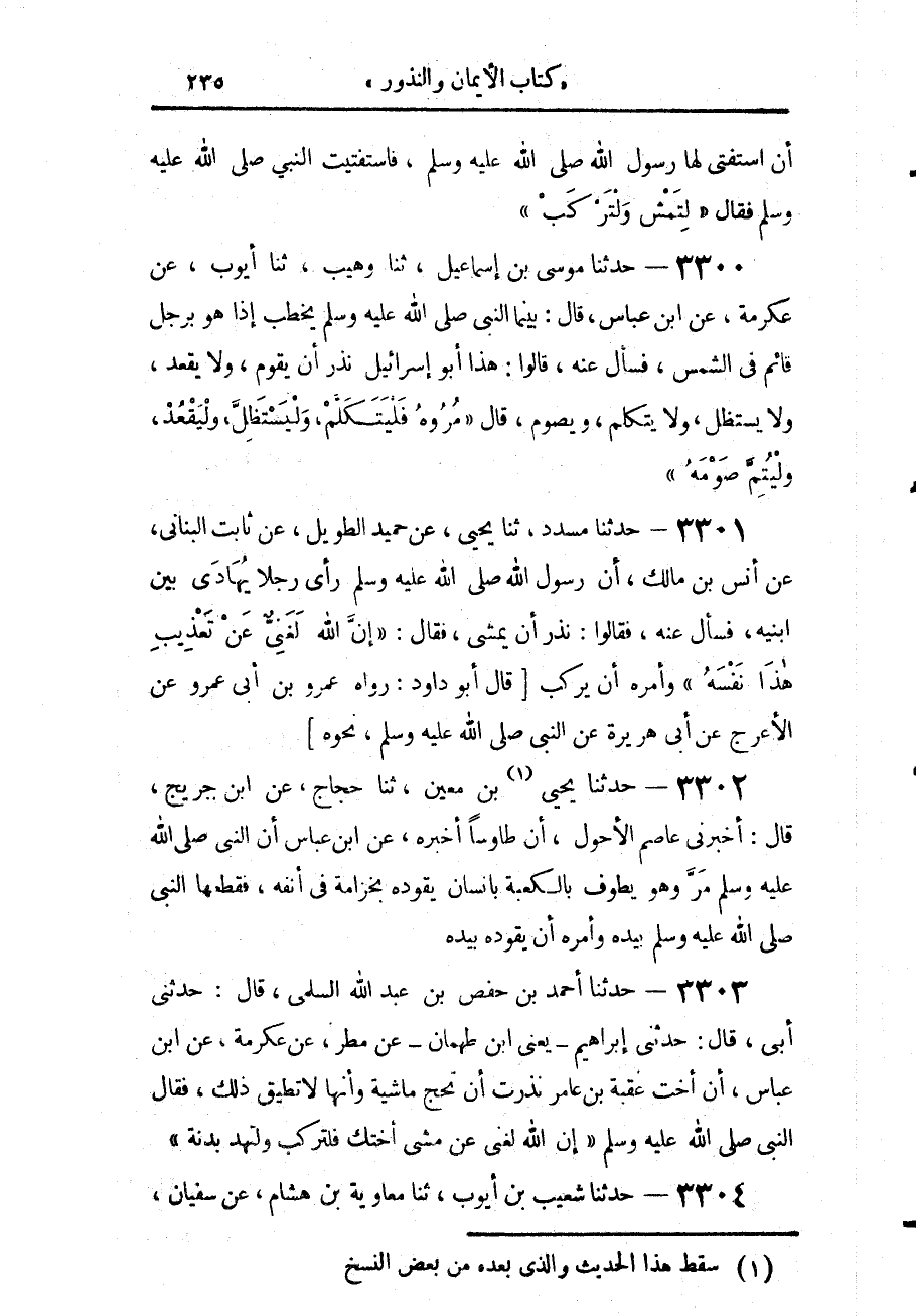 3303 - حَدَّثَنَا أَحْمَدُ بْنُ حَفْصِ بْنِ عَبْدِ اللَّهِ السُّلَمِيُّ، قَالَ: حَدَّثَنِي أَبِي، قَالَ: حَدَّثَنِي إِبْرَاهِيمُ يَعْنِي ابْنَ طَهْمَانَ، عَنْ مَطَرٍ، عَنْ عِكْرِمَةَ، عَنِ ابْنِ عَبَّاسٍ، أَنَّ أُخْتَ عُقْبَةَ بْنِ عَامِرٍ، نَذَرَتْ أَنْ تَحُجَّ مَاشِيَةً، وَأَنَّهَا لَا تُطِيقُ ذَلِكَ، فَقَالَ النَّبِيُّ صَلَّى اللهُ عَلَيْهِ وَسَلَّمَ: «إِنَّ §اللَّهَ لَغَنِيٌّ عَنْ مَشْيِ أُخْتِكَ، فَلْتَرْكَبْ وَلْتُهْدِ بَدَنَةً»
