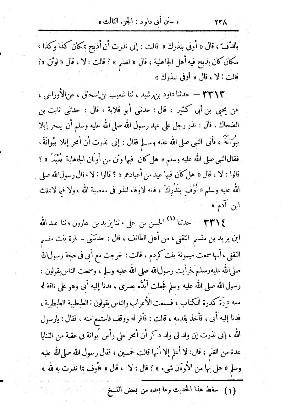 3313 - حَدَّثَنَا دَاوُدُ بْنُ رُشَيْدٍ، حَدَّثَنَا شُعَيْبُ بْنُ إِسْحَاقَ، عَنِ الْأَوْزَاعِيِّ، عَنْ يَحْيَى بْنِ أَبِي كَثِيرٍ قَالَ: حَدَّثَنِي أَبُو قِلَابَةَ، قَالَ: حَدَّثَنِي ثَابِتُ بْنُ الضَّحَّاكِ، قَالَ: نَذَرَ رَجُلٌ عَلَى عَهْدِ رَسُولِ اللَّهِ صَلَّى اللهُ عَلَيْهِ وَسَلَّمَ أَنْ يَنْحَرَ إِبِلًا بِبُوَانَةَ فَأَتَى النَّبِيَّ صَلَّى اللهُ عَلَيْهِ وَسَلَّمَ، فَقَالَ: إِنِّي نَذَرْتُ أَنْ أَنْحَرَ إِبِلًا بِبُوَانَةَ، فَقَالَ النَّبِيُّ صَلَّى اللهُ عَلَيْهِ وَسَلَّمَ: «هَلْ كَانَ فِيهَا وَثَنٌ مِنْ أَوْثَانِ الْجَاهِلِيَّةِ يُعْبَدُ؟» قَالُوا: لَا، قَالَ: «هَلْ كَانَ فِيهَا عِيدٌ مِنْ أَعْيَادِهِمْ؟»، قَالُوا: لَا، قَالَ رَسُولُ اللَّهِ صَلَّى اللهُ عَلَيْهِ وَسَلَّمَ: «§أَوْفِ بِنَذْرِكَ، فَإِنَّهُ لَا وَفَاءَ لِنَذْرٍ فِي مَعْصِيَةِ اللَّهِ، وَلَا فِيمَا لَا يَمْلِكُ ابْنُ آدَمَ»