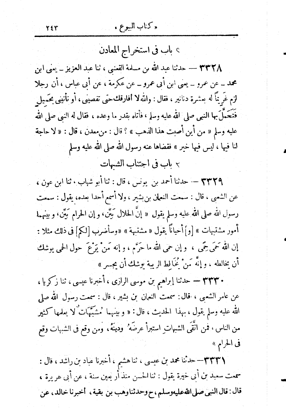 3330 - حَدَّثَنَا إِبْرَاهِيمُ بْنُ مُوسَى الرَّازِيُّ، أَخْبَرَنَا عِيسَى، حَدَّثَنَا زَكَرِيَّا، عَنْ عَامِرٍ الشَّعْبِيِّ، قَالَ: سَمِعْتُ النُّعْمَانَ بْنَ بَشِيرٍ، قَالَ: سَمِعْتُ رَسُولَ اللَّهِ صَلَّى اللهُ عَلَيْهِ وَسَلَّمَ يَقُولُ: بِهَذَا الْحَدِيثِ قَالَ: «وَبَيْنَهُمَا مُشَبَّهَاتٌ لَا يَعْلَمُهَا كَثِيرٌ مِنَ النَّاسِ، فَمَنِ اتَّقَى الشُّبُهَاتِ اسْتَبْرَأَ عِرْضَهُ وَدِينَهُ، وَمَنْ وَقَعَ فِي الشُّبُهَاتِ وَقَعَ فِي الْحَرَامِ»