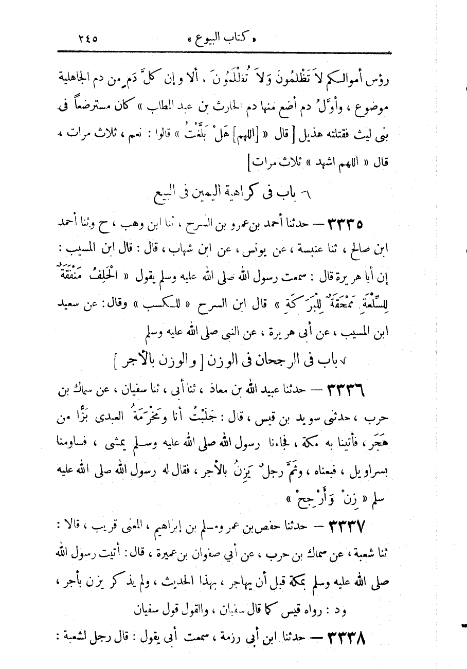 3336 - حَدَّثَنَا عُبَيْدُ اللَّهِ بْنُ مُعَاذٍ، حَدَّثَنَا أَبِي، حَدَّثَنَا سُفْيَانُ، عَنْ سِمَاكِ بْنِ حَرْبٍ، حَدَّثَنِي سُوَيْدُ بْنُ قَيْسٍ، قَالَ: جَلَبْتُ أَنَا وَمَخْرَفَةُ الْعَبْدِيُّ، بَزًّا مِنْ هَجَرَ فَأَتَيْنَا بِهِ مَكَّةَ فَجَاءَنَا رَسُولُ اللَّهِ صَلَّى اللهُ عَلَيْهِ وَسَلَّمَ يَمْشِي فَسَاوَمَنَا بِسَرَاوِيلَ، فَبِعْنَاهُ، وَثَمَّ رَجُلٌ يَزِنُ بِالْأَجْرِ، فَقَالَ لَهُ رَسُولُ اللَّهِ صَلَّى اللهُ عَلَيْهِ وَسَلَّمَ: «§زِنْ وَأَرْجِحْ»،