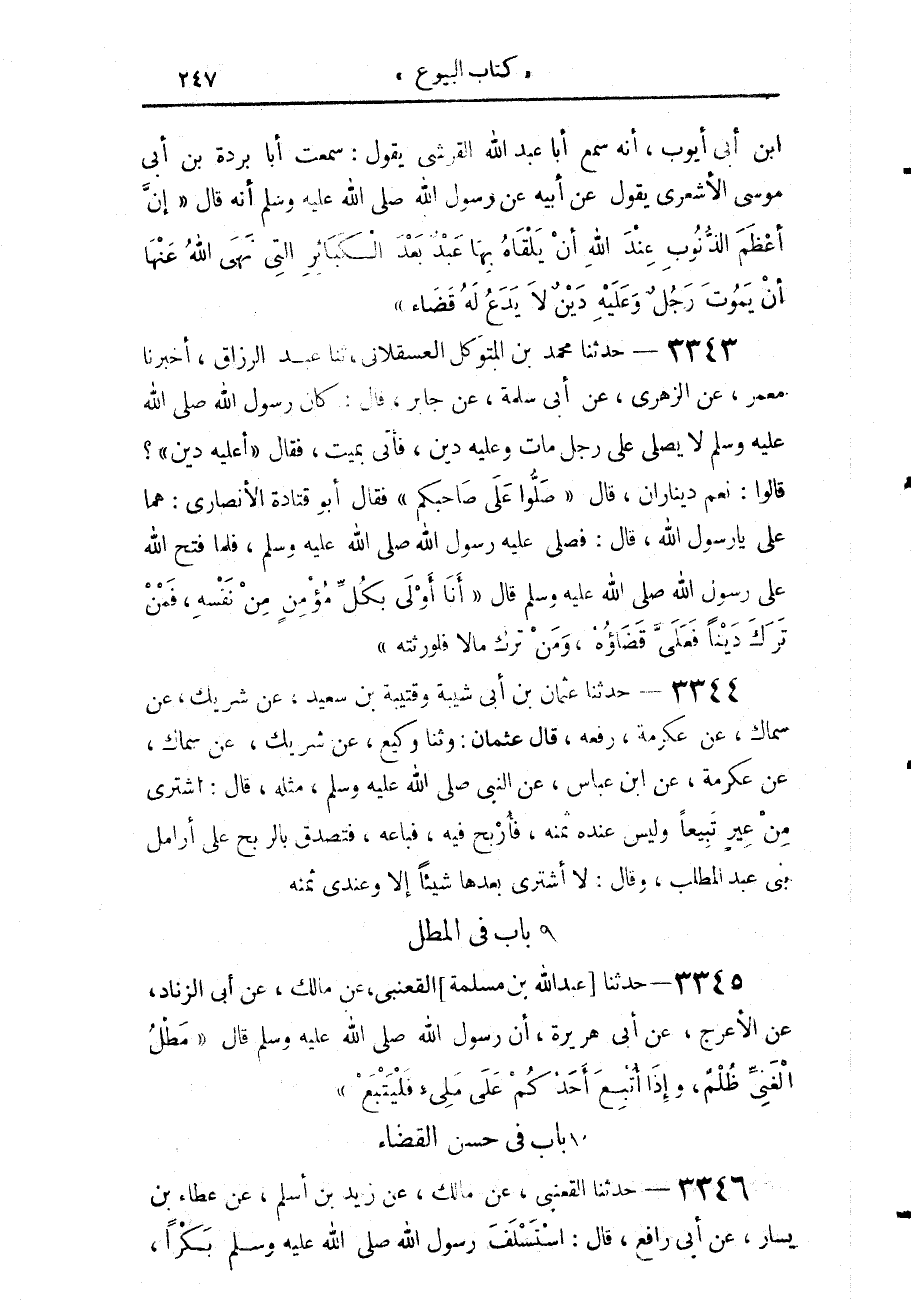 3343 - حَدَّثَنَا مُحَمَّدُ بْنُ الْمُتَوَكِّلِ الْعَسْقَلَانِيُّ، حَدَّثَنَا عَبْدُ الرَّزَّاقِ، أَخْبَرَنَا مَعْمَرٌ، عَنِ الزُّهْرِيِّ، عَنْ أَبِي سَلَمَةَ، عَنْ جَابِرٍ، قَالَ: كَانَ رَسُولُ اللَّهِ صَلَّى اللهُ عَلَيْهِ وَسَلَّمَ لَا يُصَلِّي عَلَى رَجُلٍ مَاتَ وَعَلَيْهِ دَيْنٌ، فَأُتِيَ بِمَيِّتٍ، فَقَالَ: «أَعَلَيْهِ دَيْنٌ؟» قَالُوا: نَعَمْ، دِينَارَانِ، قَالَ: «صَلُّوا عَلَى صَاحِبِكُمْ» فَقَالَ أَبُو قَتَادَةَ الْأَنْصَارِيُّ: هُمَا عَلَيَّ يَا رَسُولَ اللَّهِ، قَالَ: فَصَلَّى عَلَيْهِ رَسُولُ اللَّهِ صَلَّى اللهُ عَلَيْهِ وَسَلَّمَ، فَلَمَّا فَتَحَ اللَّهُ عَلَى رَسُولِ اللَّهِ صَلَّى اللهُ عَلَيْهِ وَسَلَّمَ، قَالَ: «§أَنَا أَوْلَى بِكُلِّ مُؤْمِنٍ مِنْ نَفْسِهِ، فَمَنْ تَرَكَ دَيْنًا فَعَلَيَّ قَضَاؤُهُ وَمَنْ تَرَكَ مَالًا فَلِوَرَثَتِهِ»،