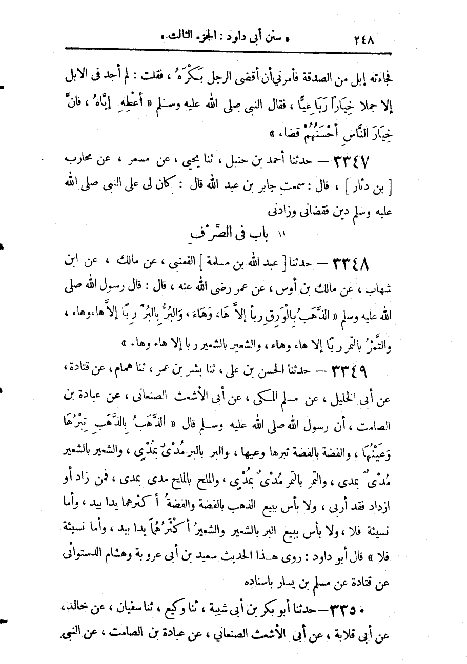 3349 - حَدَّثَنَا الْحَسَنُ بْنُ عَلِيٍّ، حَدَّثَنَا بِشْرُ بْنُ عُمَرَ، حَدَّثَنَا هَمَّامٌ، عَنْ قَتَادَةَ، عَنْ أَبِي الْخَلِيلِ، عَنْ مُسْلِمٍ الْمَكِّيِّ، عَنْ أَبِي الْأَشْعَثِ الصَّنْعَانِيِّ، عَنْ عُبَادَةَ بْنِ الصَّامِتِ، أَنَّ رَسُولَ اللَّهِ صَلَّى اللهُ عَلَيْهِ وَسَلَّمَ قَالَ: «§الذَّهَبُ بِالذَّهَبِ تِبْرُهَا وَعَيْنُهَا، وَالْفِضَّةُ بِالْفِضَّةِ تِبْرُهَا وَعَيْنُهَا، وَالْبُرُّ بِالْبُرِّ مُدْيٌ بِمُدْيٍ، وَالشَّعِيرُ بِالشَّعِيرِ مُدْيٌ بِمُدْيٍ، وَالتَّمْرُ بِالتَّمْرِ مُدْيٌ بِمُدْيٍ، وَالْمِلْحُ بِالْمِلْحِ مُدْيٌ بِمُدْيٍ، فَمَنْ زَادَ أَوِ ازْدَادَ فَقَدْ أَرْبَى، وَلَا بَأْسَ بِبَيْعِ الذَّهَبِ، بِالْفِضَّةِ وَالْفِضَّةُ أَكْثَرُهُمَا يَدًا بِيَدٍ، وَأَمَّا نَسِيئَةً فَلَا، وَلَا بَأْسَ بِبَيْعِ الْبُرِّ بِالشَّعِيرِ، وَالشَّعِيرُ أَكْثَرُهُمَا يَدًا بِيَدٍ، وَأَمَّا نَسِيئَةً فَلَا»، قَالَ أَبُو دَاوُدَ: رَوَى هَذَا الْحَدِيثَ سَعِيدُ بْنُ أَبِي عَرُوبَةَ، وَهِشَامٌ الدَّسْتُوَائِيُّ، عَنْ قَتَادَةَ، عَنْ مُسْلِمِ بْنِ يَسَارٍ، بِإِسْنَادِهِ،