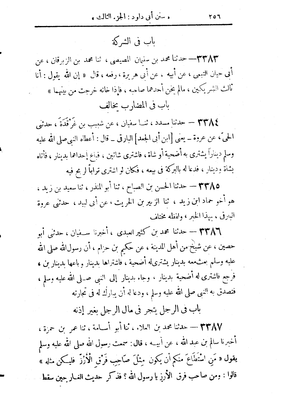 3386 - حَدَّثَنَا مُحَمَّدُ بْنُ كَثِيرٍ الْعَبْدِيُّ، أَخْبَرَنَا سُفْيَانُ، حَدَّثَنِي أَبُو حُصَيْنٍ، عَنْ شَيْخٍ، مِنْ أَهْلِ الْمَدِينَةِ، عَنْ حَكِيمِ بْنِ حِزَامٍ: «أَنَّ رَسُولَ اللَّهِ صَلَّى اللهُ عَلَيْهِ وَسَلَّمَ بَعَثَ مَعَهُ بِدِينَارٍ يَشْتَرِي لَهُ أُضْحِيَّةً، فَاشْتَرَاهَا بِدِينَارٍ، وَبَاعَهَا بِدِينَارَيْنِ، فَرَجَعَ فَاشْتَرَى لَهُ أُضْحِيَّةً بِدِينَارٍ، وَجَاءَ بِدِينَارٍ، إِلَى النَّبِيِّ صَلَّى اللهُ عَلَيْهِ وَسَلَّمَ §فَتَصَدَّقَ بِهِ النَّبِيُّ صَلَّى اللهُ عَلَيْهِ وَسَلَّمَ وَدَعَا لَهُ أَنْ يُبَارَكَ لَهُ فِي تِجَارَتِهِ»
