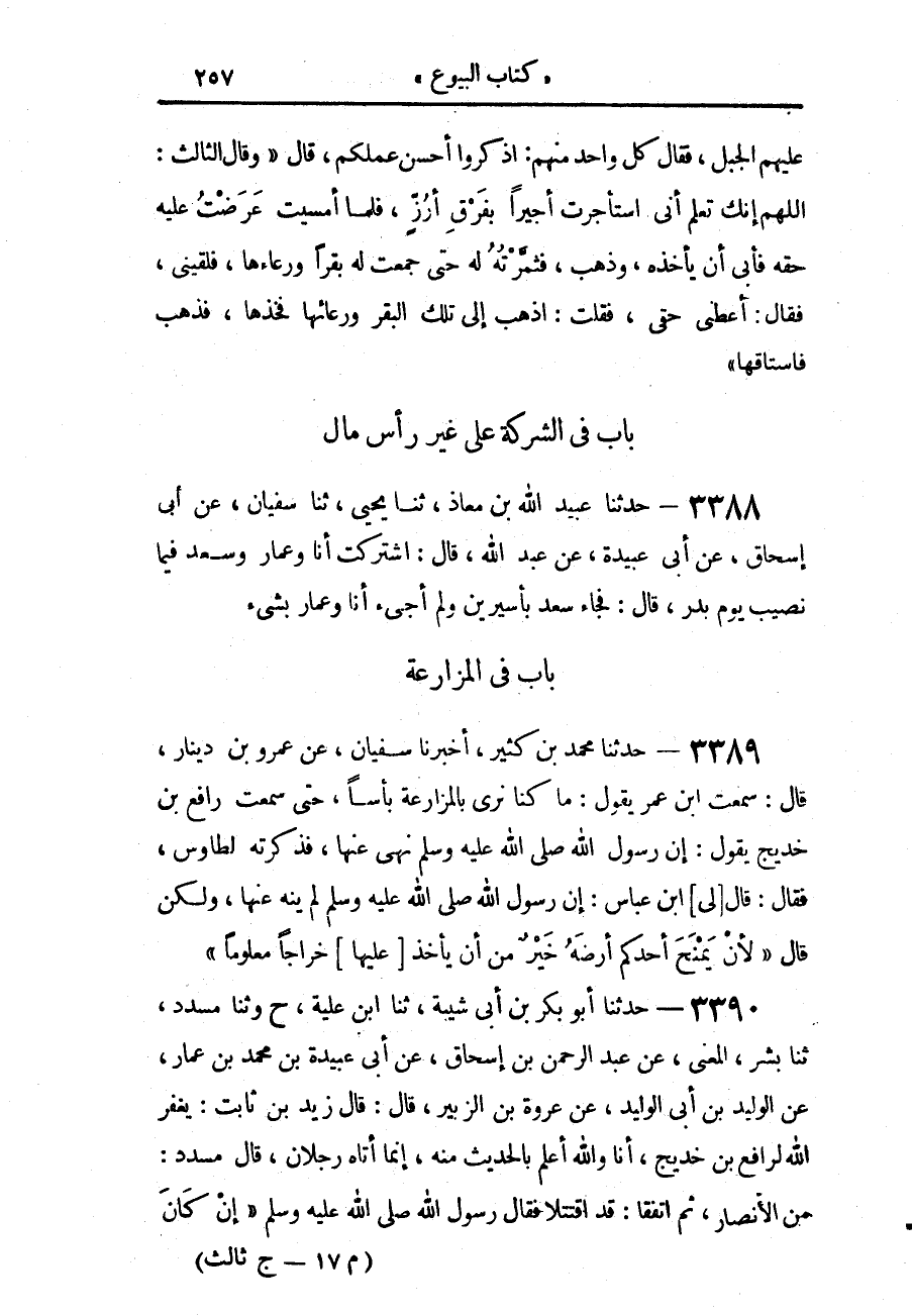 3390 - حَدَّثَنَا أَبُو بَكْرِ بْنُ أَبِي شَيْبَةَ، حَدَّثَنَا ابْنُ عُلَيَّةَ، ح وحَدَّثَنَا مُسَدَّدٌ، حَدَّثَنَا بِشْرٌ الْمَعْنَى، عَنْ عَبْدِ الرَّحْمَنِ بْنِ إِسْحَاقَ، عَنْ أَبِي عُبَيْدَةَ بْنِ مُحَمَّدِ بْنِ عَمَّارٍ، عَنِ الْوَلِيدِ بْنِ أَبِي الْوَلِيدِ، عَنْ عُرْوَةَ بْنِ الزُّبَيْرِ، قَالَ: قَالَ زَيْدُ بْنُ ثَابِتٍ: يَغْفِرُ اللَّهُ لِرَافِعِ بْنِ خَدِيجٍ، أَنَا وَاللَّهِ أَعْلَمُ بِالْحَدِيثِ مِنْهُ إِنَّمَا أَتَاهُ رَجُلَانِ، قَالَ مُسَدَّدٌ: مِنَ الْأَنْصَارِ، ثُمَّ اتَّفَقَا، قَدِ اقْتَتَلَا، فَقَالَ رَسُولُ اللَّهِ صَلَّى اللهُ عَلَيْهِ وَسَلَّمَ: «§إِنْ كَانَ -[258]- هَذَا شَأْنَكُمْ فَلَا تُكْرُوا الْمَزَارِعَ»، زَادَ مُسَدَّدٌ، فَسَمِعَ قَوْلَهُ: «لَا تُكْرُوا الْمَزَارِعَ»