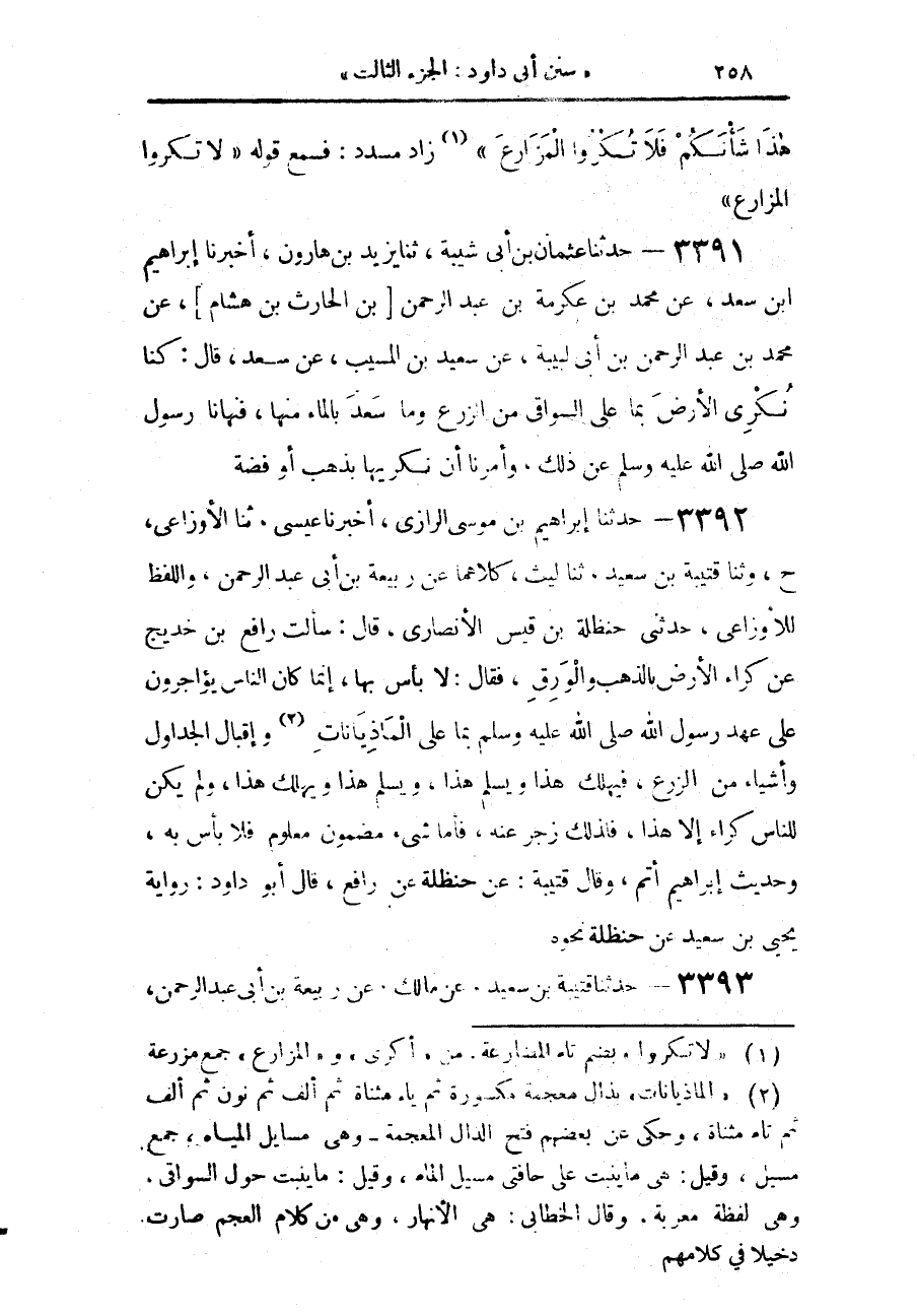 3392 - حَدَّثَنَا إِبْرَاهِيمُ بْنُ مُوسَى الرَّازِيُّ، أَخْبَرَنَا عِيسَى، حَدَّثَنَا الْأَوْزَاعِيُّ، ح وحَدَّثَنَا قُتَيْبَةُ بْنُ سَعِيدٍ، حَدَّثَنَا لَيْثٌ، كِلَاهُمَا عَنْ رَبِيعَةَ بْنِ أَبِي عَبْدِ الرَّحْمَنِ، - وَاللَّفْظُ لِلْأَوْزَاعِيِّ - حَدَّثَنِي حَنْظَلَةُ بْنُ قَيْسٍ الْأَنْصَارِيُّ، قَالَ: سَأَلْتُ رَافِعَ بْنَ خَدِيجٍ عَنْ كِرَاءِ الْأَرْضِ بِالذَّهَبِ وَالْوَرِقِ؟ فَقَالَ: «لَا بَأْسَ بِهَا إِنَّمَا §كَانَ النَّاسُ يُؤَاجِرُونَ عَلَى عَهْدِ رَسُولِ اللَّهِ صَلَّى اللهُ عَلَيْهِ وَسَلَّمَ بِمَا عَلَى الْمَاذِيَانَاتِ وَأَقْبَالِ الْجَدَاوِلِ، وَأَشْيَاءَ مِنَ الزَّرْعِ فَيَهْلَكُ هَذَا، وَيَسْلَمُ هَذَا، وَيَسْلَمُ هَذَا، وَيَهْلَكُ هَذَا، وَلَمْ يَكُنْ لِلنَّاسِ كِرَاءٌ إِلَّا هَذَا، فَلِذَلِكَ زَجَرَ عَنْهُ، فَأَمَّا شَيْءٌ مَضْمُونٌ مَعْلُومٌ، فَلَا بَأْسَ بِهِ»، وَحَدِيثُ إِبْرَاهِيمَ أَتَمُّ، وَقَالَ قُتَيْبَةُ: عَنْ حَنْظَلَةَ، عَنْ رَافِعٍ، قَالَ أَبُو دَاوُدَ: رِوَايَةُ يَحْيَى بْنِ سَعِيدٍ، عَنْ حَنْظَلَةَ نَحْوَهُ