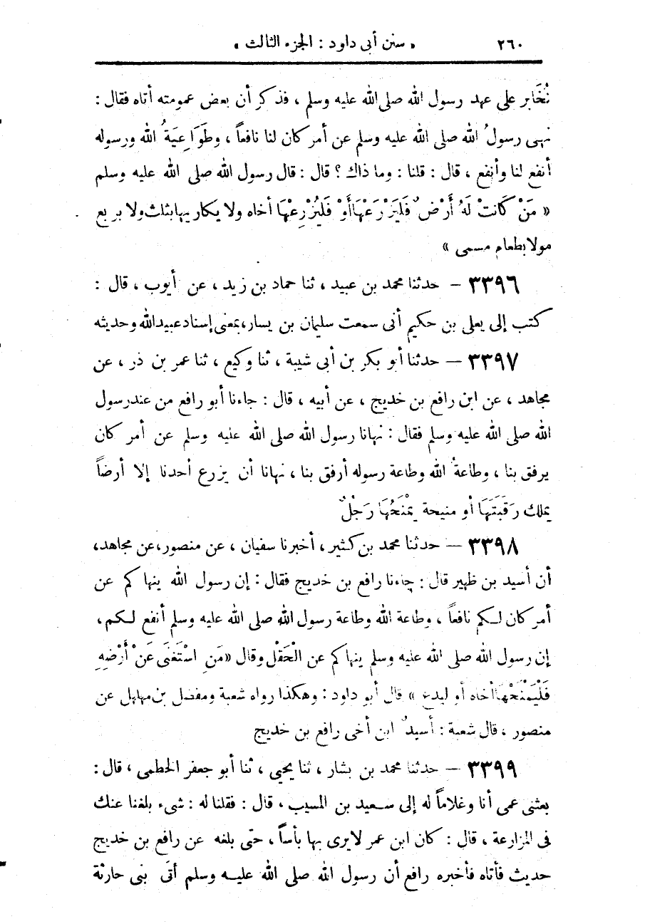 3397 - حَدَّثَنَا أَبُو بَكْرِ بْنُ أَبِي شَيْبَةَ، حَدَّثَنَا وَكِيعٌ، حَدَّثَنَا عُمَرُ بْنُ ذَرٍّ، عَنْ مُجَاهِدٍ، عَنِ ابْنِ رَافِعِ بْنِ خَدِيجٍ، عَنْ أَبِيهِ، قَالَ: جَاءَنَا أَبُو رَافِعٍ، مِنْ عِنْدِ رَسُولِ اللَّهِ صَلَّى اللهُ عَلَيْهِ وَسَلَّمَ، فَقَالَ رَسُولُ اللَّهِ صَلَّى اللهُ عَلَيْهِ وَسَلَّمَ: عَنْ أَمْرٍ كَانَ يَرْفُقُ بِنَا، وَطَاعَةُ اللَّهِ، وَطَاعَةُ رَسُولِهِ أَرْفَقُ بِنَا، «§نَهَانَا أَنْ يَزْرَعَ أَحَدُنَا، إِلَّا أَرْضًا يَمْلِكُ رَقَبَتَهَا أَوْ مَنِيحَةً يَمْنَحُهَا رَجُلٌ»