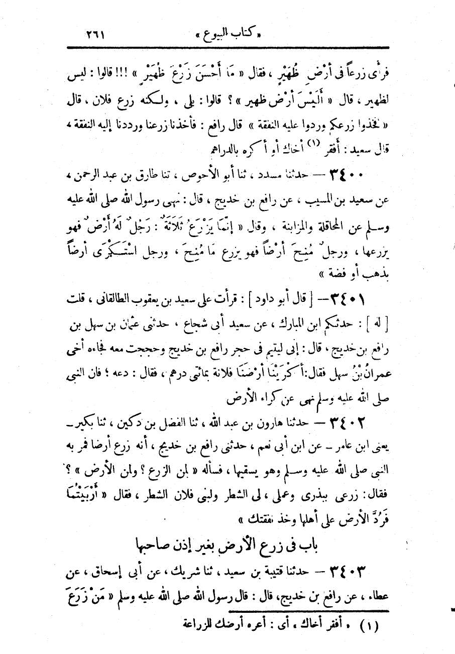 3401 - قَالَ أَبُو دَاوُدَ: قَرَأْتُ عَلَى سَعِيدِ بْنِ يَعْقُوبَ الطَّالْقَانِيِّ، قُلْتُ لَهُ: حَدَّثَكُمْ ابْنُ الْمُبَارَكِ، عَنْ سَعِيدٍ أَبِي شُجَاعٍ، حَدَّثَنِي عُثْمَانُ بْنُ سَهْلِ بْنِ رَافِعِ بْنِ خَدِيجٍ، قَالَ: إِنِّي لَيَتِيمٌ فِي حِجْرِ رَافِعِ بْنِ خَدِيجٍ، وَحَجَجْتُ مَعَهُ فَجَاءَهُ أَخِي عِمْرَانُ بْنُ سَهْلٍ، فَقَالَ: أَكْرَيْنَا أَرْضَنَا فُلَانَةَ، بِمِائَتَيْ دِرْهَمٍ، فَقَالَ: «دَعْهُ فَإِنَّ النَّبِيَّ صَلَّى اللهُ عَلَيْهِ وَسَلَّمَ §نَهَى عَنْ كِرَاءِ الْأَرْضِ»