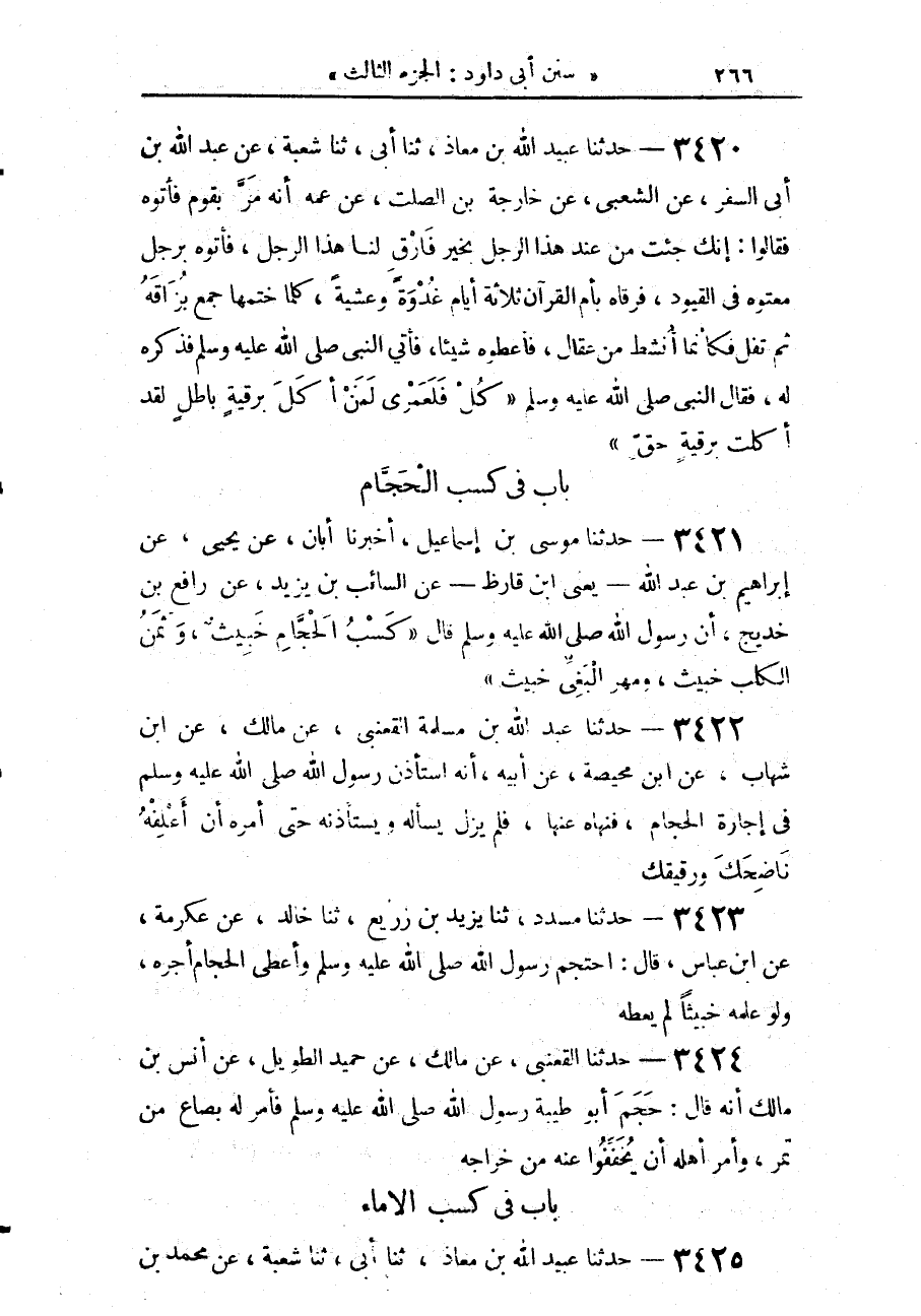 3423 - حَدَّثَنَا مُسَدَّدٌ، حَدَّثَنَا يَزِيدُ بْنُ زُرَيْعٍ، حَدَّثَنَا خَالِدٌ، عَنْ عِكْرِمَةَ، عَنِ ابْنِ عَبَّاسٍ، قَالَ: «§احْتَجَمَ رَسُولُ اللَّهِ صَلَّى اللهُ عَلَيْهِ وَسَلَّمَ وَأَعْطَى الْحَجَّامَ أَجْرَهُ وَلَوْ عَلِمَهُ خَبِيثًا لَمْ يُعْطِهِ»