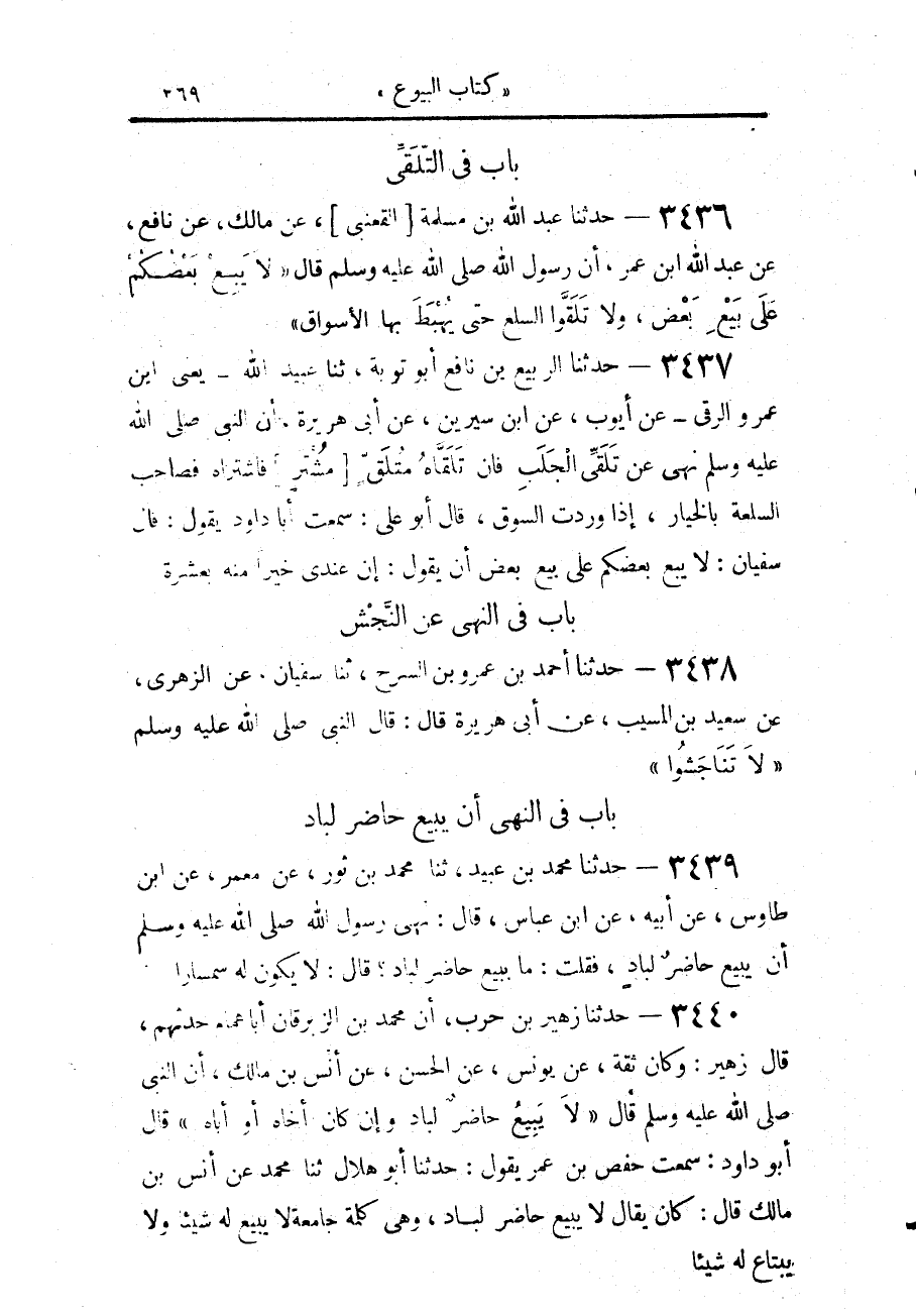 3436 - حَدَّثَنَا عَبْدُ اللَّهِ بْنُ مَسْلَمَةَ الْقَعْنَبِيُّ، عَنْ مَالِكٍ، عَنْ نَافِعٍ، عَنْ عَبْدِ اللَّهِ بْنِ عُمَرَ، أَنَّ رَسُولَ اللَّهِ صَلَّى اللهُ عَلَيْهِ وَسَلَّمَ، قَالَ: «§لَا يَبِعْ بَعْضُكُمْ عَلَى بَيْعِ بَعْضٍ، وَلَا تَلَقَّوُا السِّلَعَ حَتَّى يُهْبَطَ بِهَا الْأَسْوَاقَ»