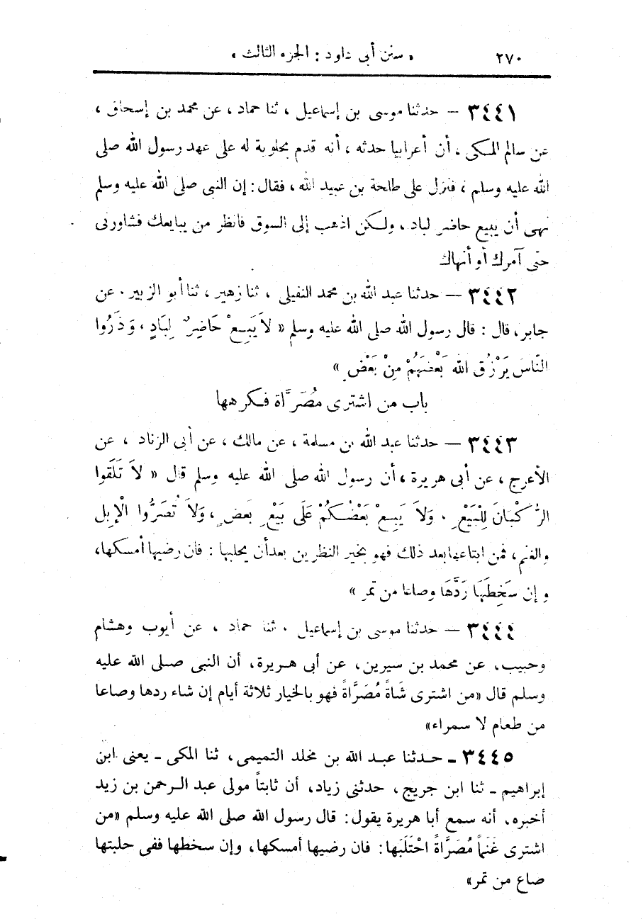 3443 - حَدَّثَنَا عَبْدُ اللَّهِ بْنُ مَسْلَمَةَ، عَنْ مَالِكٍ، عَنْ أَبِي الزِّنَادِ، عَنِ الْأَعْرَجِ، عَنْ أَبِي هُرَيْرَةَ، أَنَّ رَسُولَ اللَّهِ صَلَّى اللهُ عَلَيْهِ وَسَلَّمَ قَالَ: «§لَا تَلَقَّوْا الرُّكْبَانَ لِلْبَيْعِ، وَلَا يَبِعْ بَعْضُكُمْ عَلَى بَيْعِ بَعْضٍ، وَلَا تُصَرُّوا الْإِبِلَ وَالْغَنَمَ، فَمَنِ ابْتَاعَهَا بَعْدَ ذَلِكَ فَهُوَ بِخَيْرِ النَّظَرَيْنِ، بَعْدَ أَنْ يَحْلُبَهَا فَإِنْ رَضِيَهَا أَمْسَكَهَا، وَإِنْ سَخِطَهَا رَدَّهَا، وَصَاعًا مِنْ تَمْرٍ»