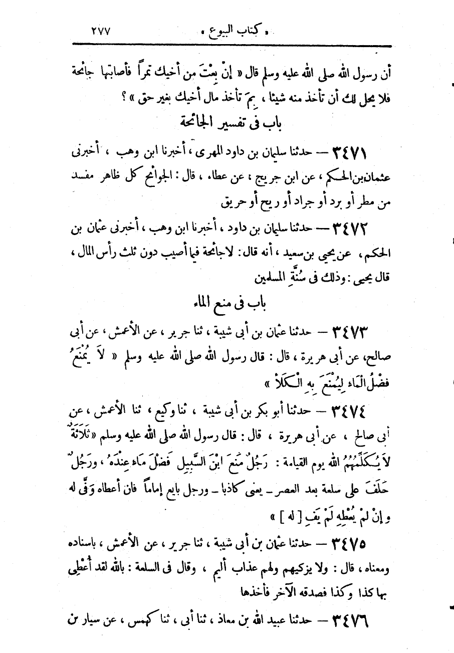 3473 - حَدَّثَنَا عُثْمَانُ بْنُ أَبِي شَيْبَةَ، حَدَّثَنَا جَرِيرٌ، عَنِ الْأَعْمَشِ، عَنْ أَبِي صَالِحٍ، عَنْ أَبِي هُرَيْرَةَ، قَالَ: قَالَ رَسُولُ اللَّهِ صَلَّى اللهُ عَلَيْهِ وَسَلَّمَ: «§لَا يُمْنَعُ فَضْلُ الْمَاءِ لِيُمْنَعَ بِهِ الْكَلَأُ»