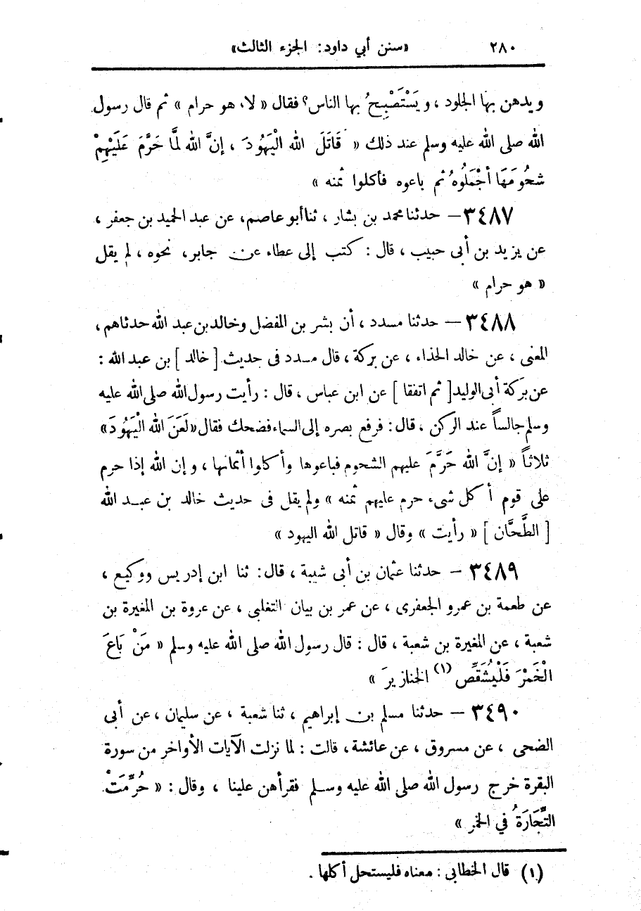 3488 - حَدَّثَنَا مُسَدَّدٌ، أَنَّ بِشْرَ بْنَ الْمُفَضَّلِ، وَخَالِدَ بْنَ عَبْدِ اللَّهِ، حَدَّثَاهُمُ الْمَعْنَى، عَنْ خَالِدٍ الْحَذَّاءِ، عَنْ بَرَكَةَ، قَالَ مُسَدَّدٌ: فِي حَدِيثِ خَالِدِ بْنِ عَبْدِ اللَّهِ، عَنْ بَرَكَةَ أَبِي الْوَلِيدِ، ثُمَّ اتَّفَقَا عَنِ ابْنِ عَبَّاسٍ، قَالَ: رَأَيْتُ رَسُولَ اللَّهِ صَلَّى اللهُ عَلَيْهِ وَسَلَّمَ جَالِسًا عِنْدَ الرُّكْنِ، قَالَ: فَرَفَعَ بَصَرَهُ إِلَى السَّمَاءِ فَضَحِكَ، فَقَالَ: «§لَعَنَ اللَّهُ الْيَهُودَ، ثَلَاثًا إِنَّ اللَّهَ حَرَّمَ عَلَيْهِمُ الشُّحُومَ فَبَاعُوهَا وَأَكَلُوا أَثْمَانَهَا، وَإِنَّ اللَّهَ إِذَا حَرَّمَ عَلَى قَوْمٍ أَكْلَ شَيْءٍ حَرَّمَ عَلَيْهِمْ ثَمَنَهُ» وَلَمْ يَقُلْ فِي حَدِيثِ خَالِدِ بْنِ عَبْدِ اللَّهِ الطَّحَّانِ: «رَأَيْتُ» وَقَالَ: «قَاتَلَ اللَّهُ الْيَهُودَ»