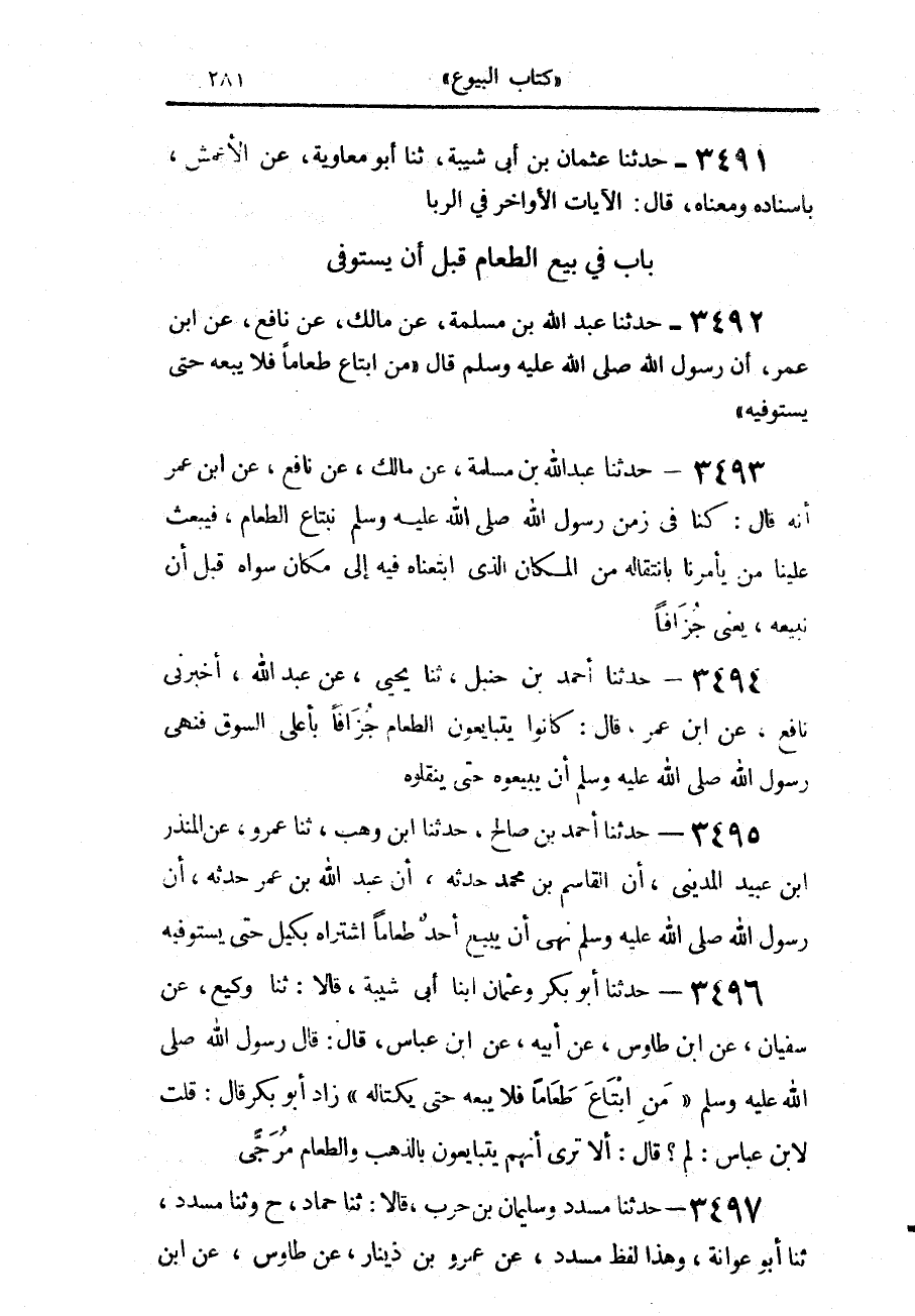 3492 - حَدَّثَنَا عَبْدُ اللَّهِ بْنُ مَسْلَمَةَ، عَنْ مَالِكٍ، عَنْ نَافِعٍ، عَنِ ابْنِ عُمَرَ، أَنَّ رَسُولَ اللَّهِ صَلَّى اللهُ عَلَيْهِ وَسَلَّمَ قَالَ: «§مَنْ ابْتَاعَ طَعَامًا فَلَا يَبِعْهُ حَتَّى يَسْتَوْفِيَهُ»