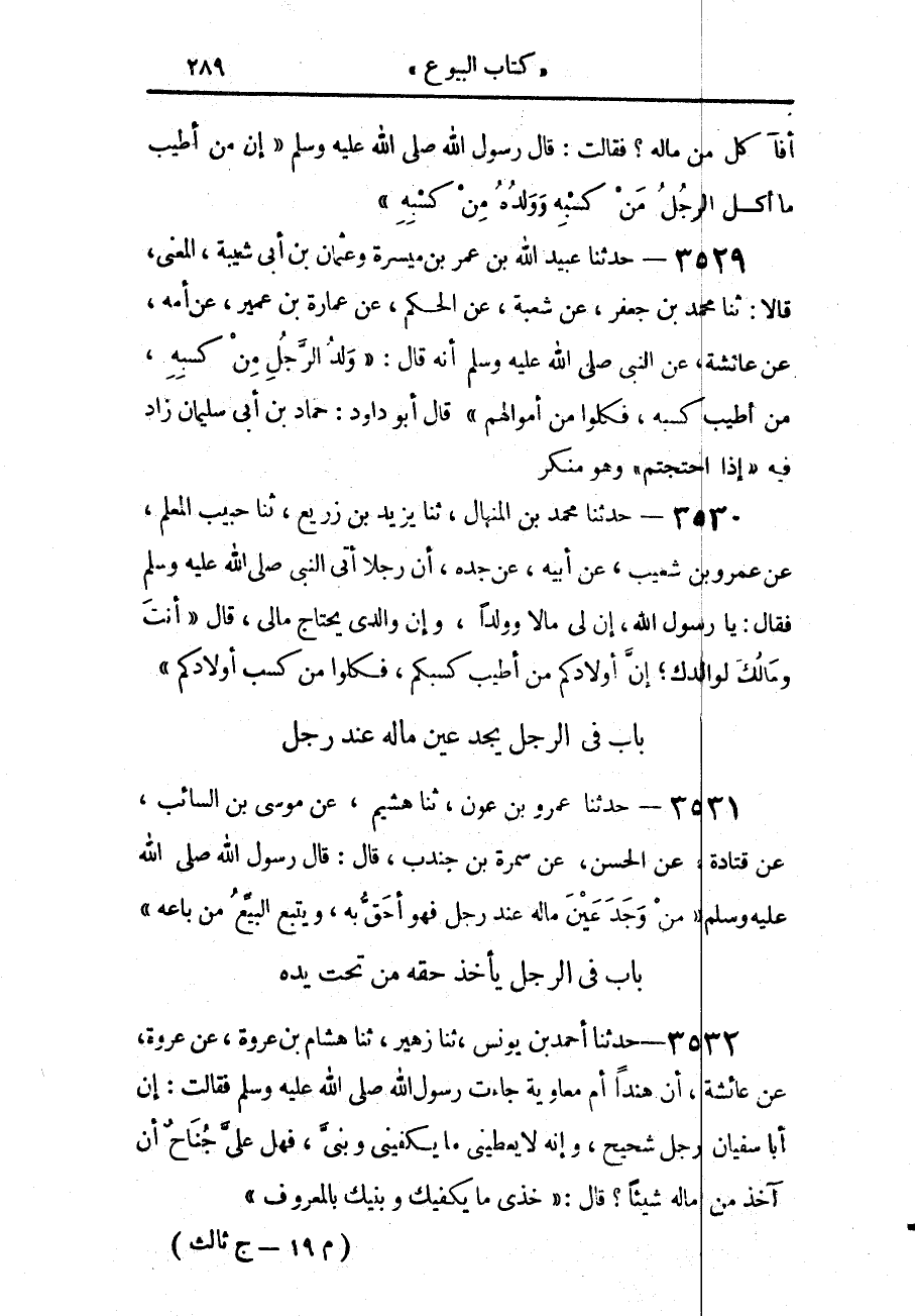 3530 - حَدَّثَنَا مُحَمَّدُ بْنُ الْمِنْهَالِ، حَدَّثَنَا يَزِيدُ بْنُ زُرَيْعٍ، حَدَّثَنَا حَبِيبٌ الْمُعَلِّمُ، عَنْ عَمْرِو بْنِ شُعَيْبٍ، عَنْ أَبِيهِ، عَنْ جَدِّهِ، أَنَّ رَجُلًا أَتَى النَّبِيَّ صَلَّى اللهُ عَلَيْهِ وَسَلَّمَ، فَقَالَ: يَا رَسُولَ اللَّهِ، إِنَّ لِي مَالًا وَوَلَدًا، وَإِنَّ وَالِدِي يَحْتَاجُ مَالِي؟ قَالَ: «أَنْتَ وَمَالُكَ لِوَالِدِكَ، إِنَّ §أَوْلَادَكُمْ مِنْ أَطْيَبِ كَسْبِكُمْ، فَكُلُوا مِنْ كَسْبِ أَوْلَادِكُمْ»