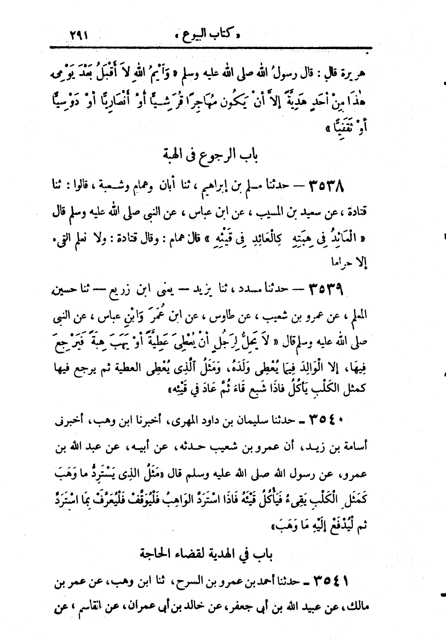 3539 - حَدَّثَنَا مُسَدَّدٌ، حَدَّثَنَا يَزِيدُ يَعْنِي ابْنَ زُرَيْعٍ، حَدَّثَنَا حُسَيْنٌ الْمُعَلِّمُ، عَنْ عَمْرِو بْنِ شُعَيْبٍ، عَنْ طَاوُسٍ، عَنِ ابْنِ عُمَرَ، وَابْنِ عَبَّاسٍ، عَنِ النَّبِيِّ صَلَّى اللهُ عَلَيْهِ وَسَلَّمَ قَالَ: «§لَا يَحِلُّ لِرَجُلٍ أَنْ يُعْطِيَ عَطِيَّةً أَوْ يَهَبَ هِبَةً فَيَرْجِعَ فِيهَا إِلَّا الْوَالِدَ فِيمَا يُعْطِي وَلَدَهُ، وَمَثَلُ الَّذِي يُعْطِي الْعَطِيَّةَ، ثُمَّ يَرْجِعُ فِيهَا كَمَثَلِ الْكَلْبِ يَأْكُلُ فَإِذَا شَبِعَ قَاءَ، ثُمَّ عَادَ فِي قَيْئِهِ»