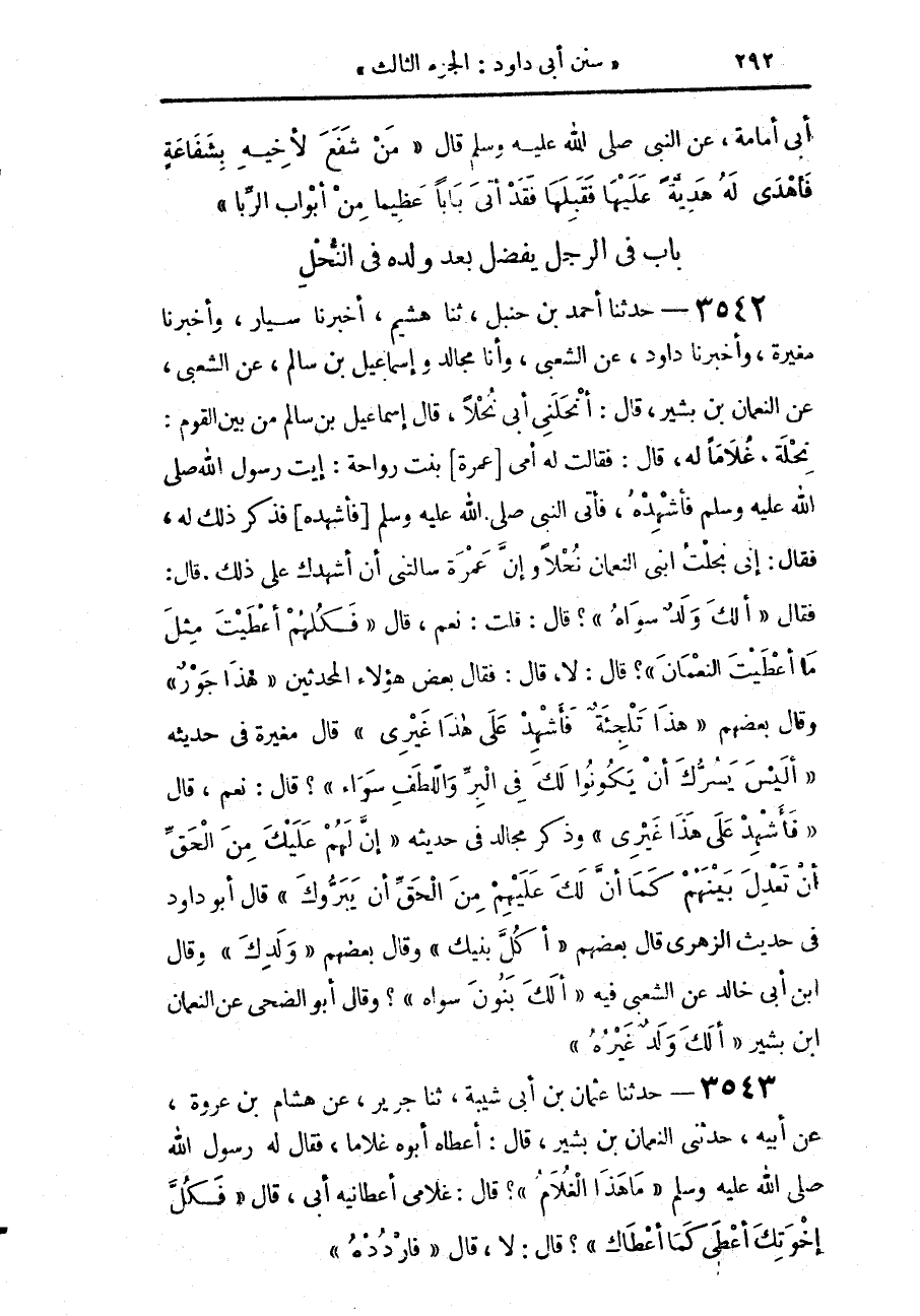 3542 - حَدَّثَنَا أَحْمَدُ بْنُ حَنْبَلٍ، حَدَّثَنَا هُشَيْمٌ، أَخْبَرَنَا سَيَّارٌ، وَأَخْبَرَنَا مُغِيرَةُ، وَأَخْبَرَنَا دَاوُدُ، عَنِ الشَّعْبِيِّ، وَأَخْبَرَنَا مُجَالِدٌ، وَإِسْمَاعِيلُ بْنُ سَالِمٍ، عَنِ الشَّعْبِيِّ، عَنِ النُّعْمَانِ بْنِ بَشِيرٍ، قَالَ أَنْحَلَنِي: أَبِي نُحْلًا، قَالَ إِسْمَاعِيلُ بْنُ سَالِمٍ: مِنْ بَيْنِ الْقَوْمِ نِحْلَةً غُلَامًا لَهُ، قَالَ: فَقَالَتْ لَهُ: أُمِّي عَمْرَةُ بِنْتُ رَوَاحَةَ ائْتِ رَسُولَ اللَّهِ صَلَّى اللهُ عَلَيْهِ وَسَلَّمَ فَأَشْهِدْهُ فَأَتَى النَّبِيَّ صَلَّى اللهُ عَلَيْهِ وَسَلَّمَ فَأَشْهَدَهُ، فَذَكَرَ ذَلِكَ لَهُ، فَقَالَ لَهُ: إِنِّي نَحَلْتُ ابْنِي النُّعْمَانَ نُحْلًا وَإِنَّ عَمْرَةَ سَأَلَتْنِي أَنْ أُشْهِدَكَ عَلَى ذَلِكَ، قَالَ: فَقَالَ: «أَلَكَ وَلَدٌ سِوَاهُ؟» قَالَ: قُلْتُ: نَعَمْ، قَالَ: «فَكُلَّهُمْ أَعْطَيْتَ مِثْلَ مَا أَعْطَيْتَ النُّعْمَانَ؟» قَالَ: لَا، قَالَ: فَقَالَ: بَعْضُ هَؤُلَاءِ الْمُحَدِّثِينَ، " §هَذَا جَوْرٌ وَقَالَ بَعْضُهُمْ: «هَذَا تَلْجِئَةٌ فَأَشْهِدْ عَلَى هَذَا غَيْرِي» قَالَ مُغِيرَةُ: فِي حَدِيثِهِ «أَلَيْسَ يَسُرُّكَ أَنْ يَكُونُوا لَكَ فِي الْبِرِّ وَاللُّطْفِ سَوَاءٌ» قَالَ: نَعَمْ، قَالَ: «فَأَشْهِدْ عَلَى هَذَا غَيْرِي» وَذَكَرَ مُجَالِدٌ فِي حَدِيثِهِ «إِنَّ لَهُمْ عَلَيْكَ مِنَ الْحَقِّ أَنْ تَعْدِلَ بَيْنَهُمْ كَمَا أَنَّ لَكَ عَلَيْهِمْ مِنَ الْحَقِّ أَنْ يَبَرُّوكَ» قَالَ أَبُو دَاوُدَ: فِي حَدِيثِ الزُّهْرِيِّ، قَالَ بَعْضُهُمْ: «أَكُلَّ بَنِيكَ»، وَقَالَ بَعْضُهُمْ: «وَلَدِكَ» وَقَالَ ابْنُ أَبِي خَالِدٍ، عَنِ الشَّعْبِيِّ، فِيهِ: «أَلَكَ بَنُونَ سِوَاهُ»، وَقَالَ أَبُو الضُّحَى، عَنِ النُّعْمَانِ بْنِ بَشِيرٍ: «أَلَكَ وَلَدٌ غَيْرُهُ»
