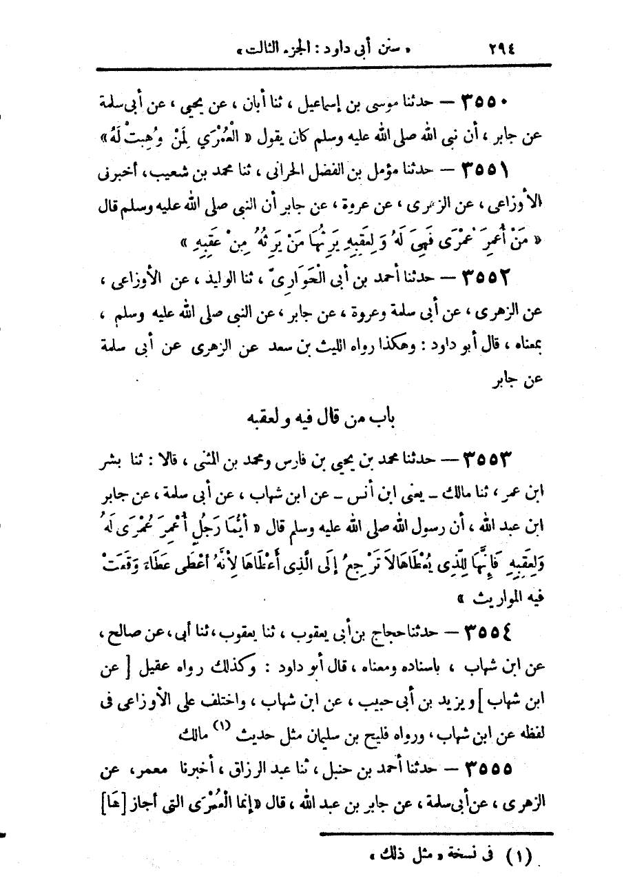 3552 - حَدَّثَنَا أَحْمَدُ بْنُ أَبِي الْحَوَارِيِّ، حَدَّثَنَا الْوَلِيدُ، عَنِ الْأَوْزَاعِيِّ، عَنِ الزُّهْرِيِّ، عَنْ أَبِي سَلَمَةَ، وَعُرْوَةَ، عَنْ جَابِرٍ، عَنِ النَّبِيِّ صَلَّى اللهُ عَلَيْهِ وَسَلَّمَ بِمَعْنَاهُ، قَالَ أَبُو دَاوُدَ: وَهَكَذَا رَوَاهُ اللَّيْثُ بْنُ سَعْدٍ، عَنِ الزُّهْرِيِّ، عَنْ أَبِي سَلَمَةَ، عَنْ جَابِرٍ