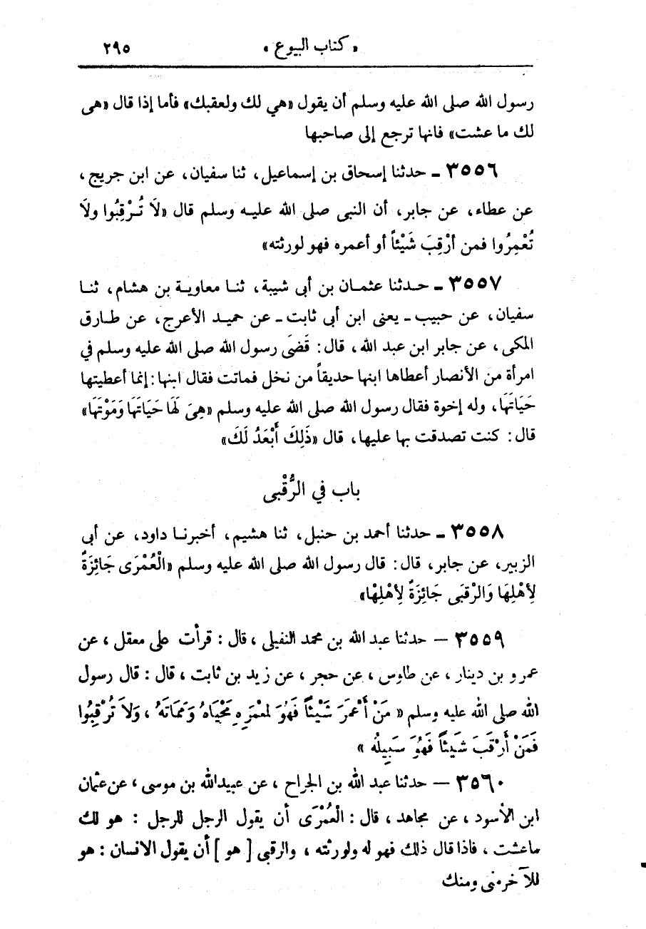 3556 - حَدَّثَنَا إِسْحَاقُ بْنُ إِسْمَاعِيلَ، حَدَّثَنَا سُفْيَانُ، عَنِ ابْنِ جُرَيْجٍ، عَنْ عَطَاءٍ، عَنْ جَابِرٍ، أَنَّ النَّبِيَّ صَلَّى اللهُ عَلَيْهِ وَسَلَّمَ قَالَ: «§لَا تُرْقِبُوا وَلَا تُعْمِرُوا فَمَنْ أُرْقِبَ شَيْئًا أَوْ أُعْمِرَهُ فَهُوَ لِوَرَثَتِهِ»