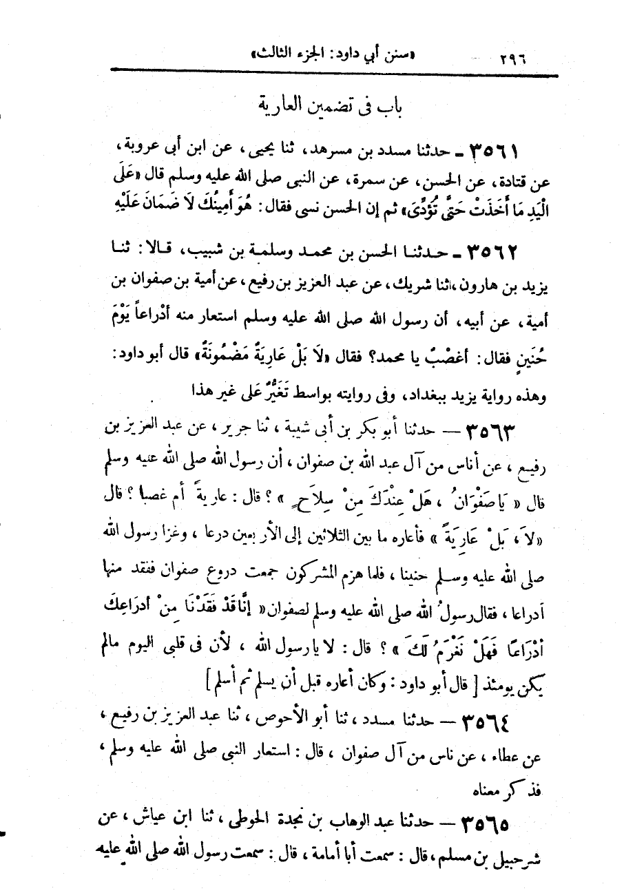 3563 - حَدَّثَنَا أَبُو بَكْرِ بْنُ أَبِي شَيْبَةَ، حَدَّثَنَا جَرِيرٌ، عَنْ عَبْدِ الْعَزِيزِ بْنِ رُفَيْعٍ، عَنْ أُنَاسٍ، مِنْ آلِ عَبدِ اللَّهِ بْنِ صَفْوَانَ أَنَّ رَسُولَ اللَّهِ صَلَّى اللهُ عَلَيْهِ وَسَلَّمَ قَالَ: «يَا صَفْوَانُ، هَلْ عِنْدَكَ مِنْ سِلَاحٍ؟»، قَالَ: عَوَرً أَمْ غَصْبًا، قَالَ: «§لَا، بَلْ عَوَرً» فَأَعَارَهُ مَا بَيْنَ الثَّلَاثِينَ إِلَى الْأَرْبَعِينَ دِرْعًا، وَغَزَا رَسُولُ اللَّهِ صَلَّى اللهُ عَلَيْهِ وَسَلَّمَ حُنَيْنًا، فَلَمَّا هُزِمَ الْمُشْرِكُونَ جُمِعَتْ دُرُوعُ صَفْوَانَ فَفَقَدَ مِنْهَا أَدْرَاعًا، فَقَالَ رَسُولُ اللَّهِ صَلَّى اللهُ عَلَيْهِ وَسَلَّمَ لِصَفْوَانَ: «إِنَّا قَدْ فَقَدْنَا مِنْ أَدْرَاعِكَ أَدْرَاعًا، فَهَلْ نَغْرَمُ لَكَ؟» قَالَ: لَا، يَا رَسُولَ اللَّهِ، لِأَنَّ فِي قَلْبِي الْيَوْمَ مَا لَمْ يَكُنْ يَوْمَئِذٍ، قَالَ أَبُو دَاوُدَ: «وَكَانَ أَعَارَهُ قَبْلَ أَنْ يُسْلِمَ، ثُمَّ أَسْلَمَ»،