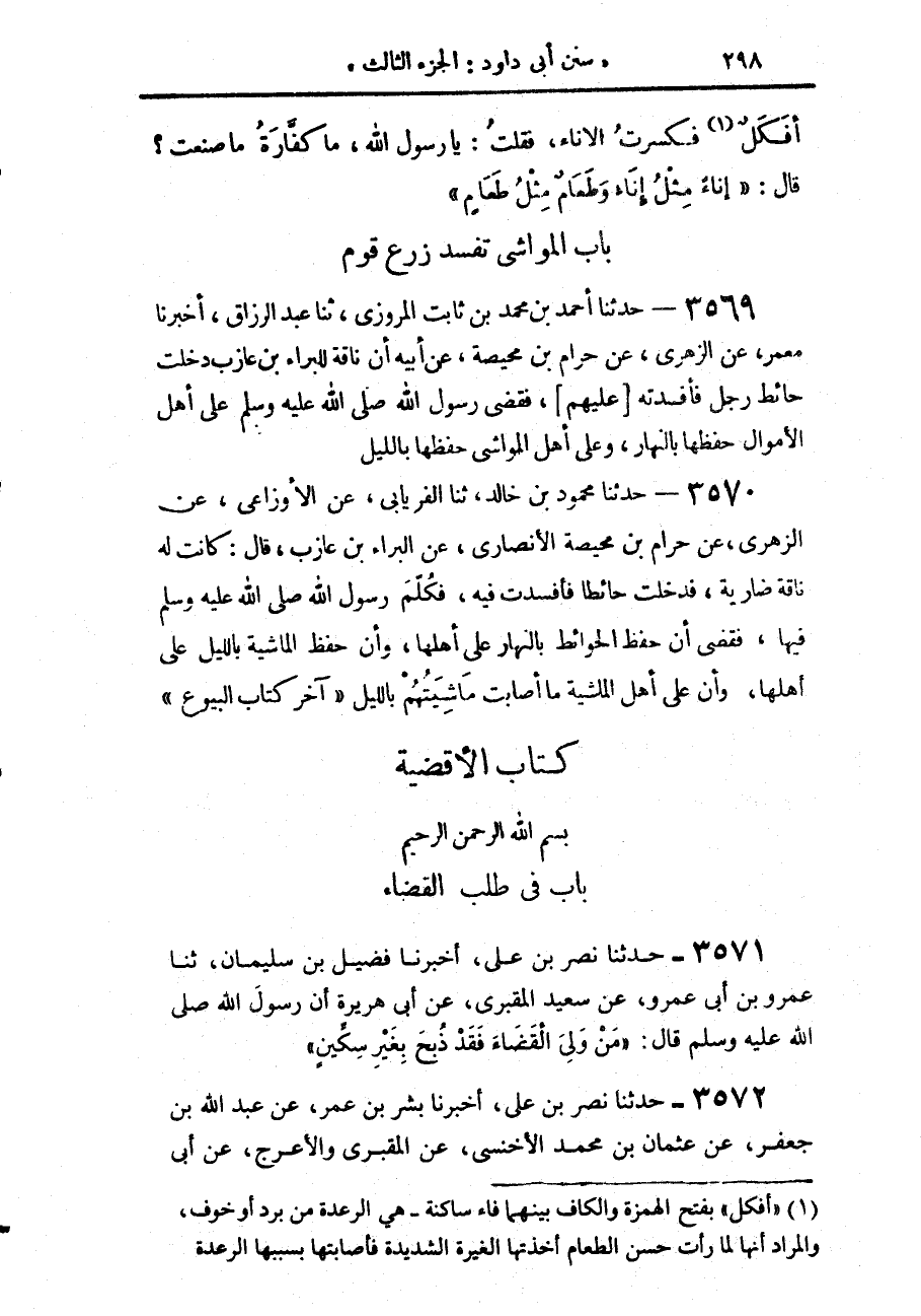 3570 - حَدَّثَنَا مَحْمُودُ بْنُ خَالِدٍ، حَدَّثَنَا الْفِرْيَابِيُّ، عَنِ الْأَوْزَاعِيِّ، عَنِ الزُّهْرِيِّ، عَنْ حَرَامِ بْنِ مُحَيِّصَةَ الْأَنْصَارِيِّ، عَنِ الْبَرَاءِ بْنِ عَازِبٍ، قَالَ: كَانَتْ لَهُ نَاقَةٌ ضَارِيَةٌ فَدَخَلَتْ حَائِطًا فَأَفْسَدَتْ فِيهِ، فَكُلِّمَ رَسُولُ اللَّهِ صَلَّى اللهُ عَلَيْهِ وَسَلَّمَ فِيهَا: «§فَقَضَى أَنَّ حِفْظَ الْحَوَائِطِ بِالنَّهَارِ عَلَى أَهْلِهَا، وَأَنَّ حِفْظَ الْمَاشِيَةِ بِاللَّيْلِ عَلَى أَهْلِهَا، وَأَنَّ عَلَى أَهْلِ الْمَاشِيَةِ مَا أَصَابَتْ مَاشِيَتُهُمْ بِاللَّيْلِ»