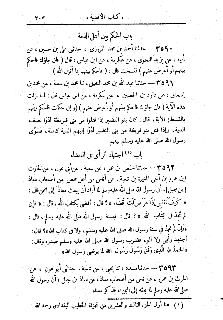 3592 - حَدَّثَنَا حَفْصُ بْنُ عُمَرَ، عَنْ شُعْبَةَ، عَنْ أَبِي عَوْنٍ، عَنِ الْحَارِثِ بْنِ عَمْرِو ابْنِ أَخِي الْمُغِيرَةِ بْنِ شُعْبَةَ، عَنْ أُنَاسٍ مِنْ أَهْلِ حِمْصٍ، مِنْ أَصْحَابِ مُعَاذِ بْنِ جَبَلٍ، أَنَّ رَسُولَ اللَّهِ صَلَّى اللهُ عَلَيْهِ وَسَلَّمَ لَمَّا أَرَادَ أَنْ يَبْعَثَ مُعَاذًا إِلَى الْيَمَنِ قَالَ: «§كَيْفَ تَقْضِي إِذَا عَرَضَ لَكَ قَضَاءٌ؟»، قَالَ: أَقْضِي بِكِتَابِ اللَّهِ، قَالَ: «فَإِنْ لَمْ تَجِدْ فِي كِتَابِ اللَّهِ؟»، قَالَ: فَبِسُنَّةِ رَسُولِ اللَّهِ صَلَّى اللهُ عَلَيْهِ وَسَلَّمَ، قَالَ: «فَإِنْ لَمْ تَجِدْ فِي سُنَّةِ رَسُولِ اللَّهِ صَلَّى اللهُ عَلَيْهِ وَسَلَّمَ، وَلَا فِي كِتَابِ اللَّهِ؟» قَالَ: أَجْتَهِدُ رَأْيِي، وَلَا آلُو فَضَرَبَ رَسُولُ اللَّهِ صَلَّى اللهُ عَلَيْهِ وَسَلَّمَ صَدْرَهُ، وَقَالَ: «الْحَمْدُ لِلَّهِ الَّذِي وَفَّقَ رَسُولَ، رَسُولِ اللَّهِ لِمَا يُرْضِي رَسُولَ اللَّهِ»،