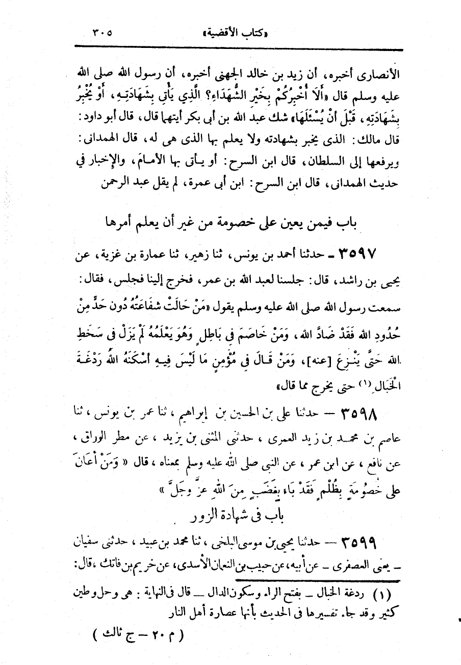 3597 - حَدَّثَنَا أَحْمَدُ بْنُ يُونُسَ، حَدَّثَنَا زُهَيْرٌ، حَدَّثَنَا عُمَارَةَ بْنِ غَزِيَّةَ، عَنْ يَحْيَى بْنِ رَاشِدٍ، قَالَ: جَلَسْنَا لِعَبْدِ اللَّهِ بْنِ عُمَرَ فَخَرَجَ إِلَيْنَا فَجَلَسَ، فَقَالَ: سَمِعْتُ رَسُولَ اللَّهِ صَلَّى اللهُ عَلَيْهِ وَسَلَّمَ يَقُولُ: «§مَنْ حَالَتْ شَفَاعَتُهُ دُونَ حَدٍّ مِنْ حُدُودِ اللَّهِ، فَقَدْ ضَادَّ اللَّهَ، وَمَنْ خَاصَمَ فِي بَاطِلٍ وَهُوَ يَعْلَمُهُ، لَمْ يَزَلْ فِي سَخَطِ اللَّهِ حَتَّى يَنْزِعَ عَنْهُ، وَمَنْ قَالَ فِي مُؤْمِنٍ مَا لَيْسَ فِيهِ أَسْكَنَهُ اللَّهُ رَدْغَةَ الْخَبَالِ حَتَّى يَخْرُجَ مِمَّا قَالَ»،