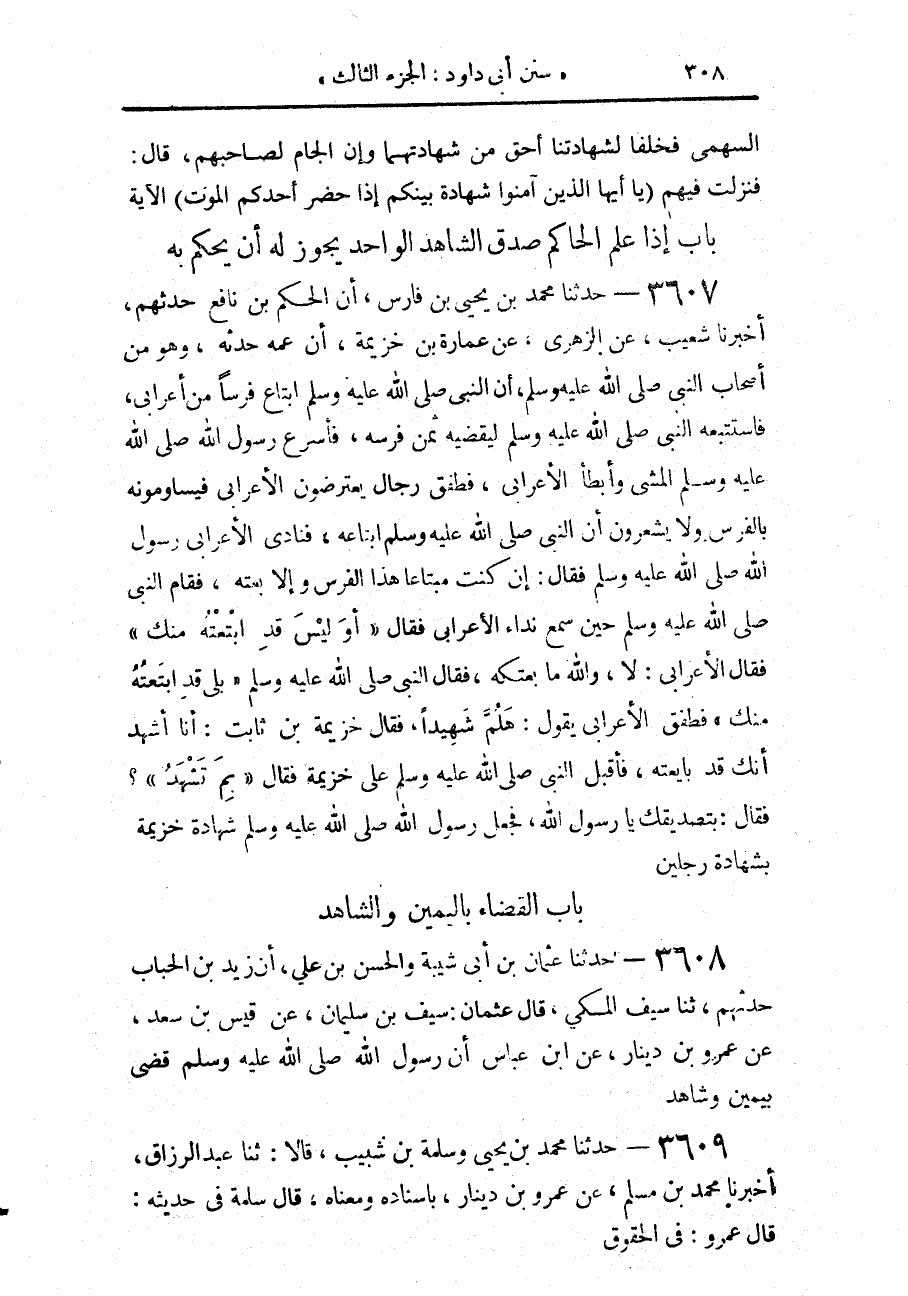 3607 - حَدَّثَنَا مُحَمَّدُ بْنُ يَحْيَى بْنِ فَارِسٍ، أَنَّ الْحَكَمَ بْنَ نَافِعٍ، حَدَّثَهُمْ أَخْبَرَنَا شُعَيْبٌ، عَنِ الزُّهْرِيِّ، عَنْ عُمَارَةَ بْنِ خُزَيْمَةَ، أَنَّ عَمَّهُ، حَدَّثَهُ وَهُوَ مِنْ أَصْحَابِ النَّبِيِّ صَلَّى اللهُ عَلَيْهِ وَسَلَّمَ أَنَّ النَّبِيَّ صَلَّى اللهُ عَلَيْهِ وَسَلَّمَ ابْتَاعَ فَرَسًا مِنْ أَعْرَابِيٍّ، فَاسْتَتْبَعَهُ النَّبِيُّ صَلَّى اللهُ عَلَيْهِ وَسَلَّمَ لِيَقْضِيَهُ ثَمَنَ فَرَسِهِ، فَأَسْرَعَ رَسُولُ اللَّهِ صَلَّى اللهُ عَلَيْهِ وَسَلَّمَ الْمَشْيَ وَأَبْطَأَ الْأَعْرَابِيُّ، فَطَفِقَ رِجَالٌ يَعْتَرِضُونَ الْأَعْرَابِيَّ، فَيُسَاوِمُونَهُ بِالْفَرَسِ وَلَا يَشْعُرُونَ أَنَّ النَّبِيَّ صَلَّى اللهُ عَلَيْهِ وَسَلَّمَ ابْتَاعَهُ، فَنَادَى الْأَعْرَابِيُّ رَسُولَ اللَّهِ صَلَّى اللهُ عَلَيْهِ وَسَلَّمَ، فَقَالَ: إِنْ كُنْتَ مُبْتَاعًا هَذَا الْفَرَسِ وَإِلَّا بِعْتُهُ؟ فَقَامَ النَّبِيُّ صَلَّى اللهُ عَلَيْهِ وَسَلَّمَ حِينَ سَمِعَ نِدَاءَ الْأَعْرَابِيِّ، فَقَالَ: «أَوْ لَيْسَ قَدِ ابْتَعْتُهُ مِنْكَ؟» فَقَالَ الْأَعْرَابِيُّ: لَا، وَاللَّهِ مَا بِعْتُكَهُ، فَقَالَ النَّبِيُّ صَلَّى اللهُ عَلَيْهِ وَسَلَّمَ: «بَلَى، قَدِ ابْتَعْتُهُ مِنْكَ» فَطَفِقَ الْأَعْرَابِيُّ، يَقُولُ هَلُمَّ شَهِيدًا، فَقَالَ خُزَيْمَةُ بْنُ ثَابِتٍ: أَنَا أَشْهَدُ أَنَّكَ قَدْ بَايَعْتَهُ، فَأَقْبَلَ النَّبِيُّ صَلَّى اللهُ عَلَيْهِ وَسَلَّمَ عَلَى خُزَيْمَةَ فَقَالَ: «بِمَ تَشْهَدُ؟»، فَقَالَ: بِتَصْدِيقِكَ يَا رَسُولَ اللَّهِ §فَجَعَلَ رَسُولُ اللَّهِ صَلَّى اللهُ عَلَيْهِ وَسَلَّمَ شَهَادَةَ خُزَيْمَةَ بِشَهَادَةِ رَجُلَيْنِ